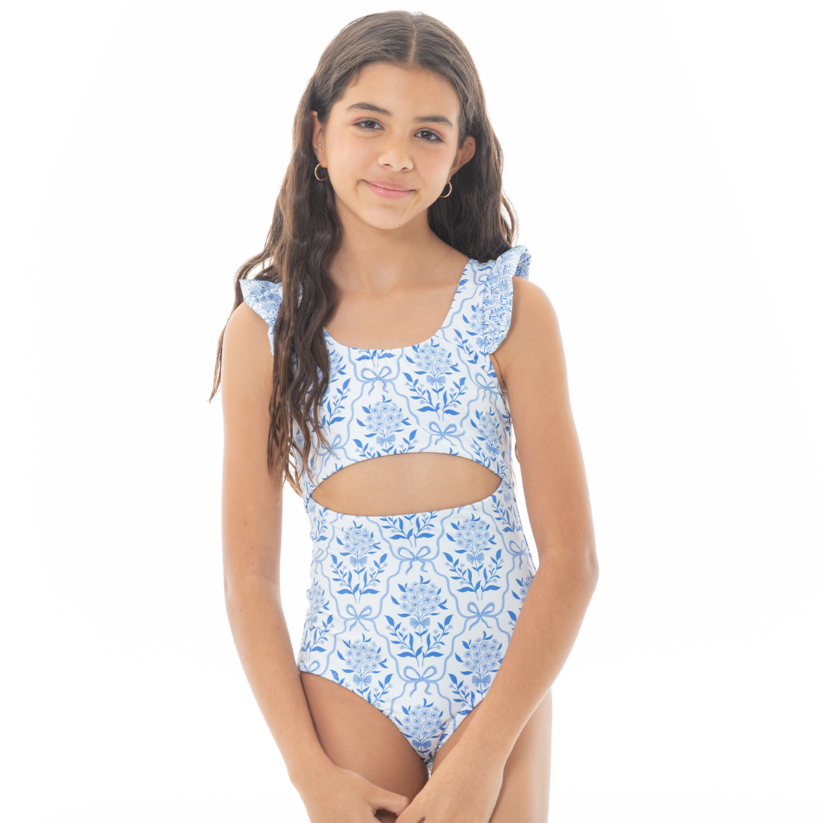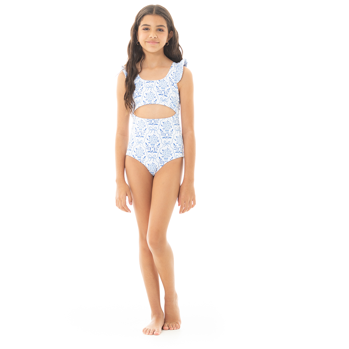 Feminine one-piece swimsuit in a delicate blue floral print. Designed with elasticated ruffled straps and a subtle cut-out below the bust. Soft stretch fabric with UV Protection 50+ for comfort and sunny days by the water.