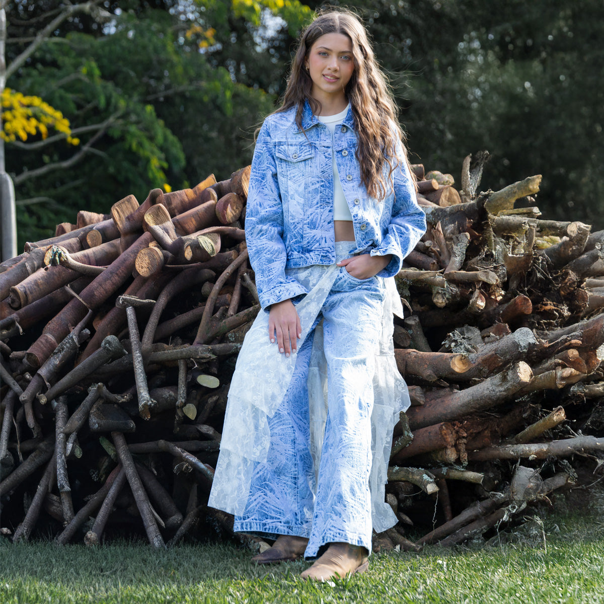 These wide-leg jeans elevate everyday style with a unique jacquard texture inspired by tropical foliage. Soft, comfortable, and beautifully detailed, they offer a standout look while staying easy to wear. A perfect statement denim piece for girls who love fashion with personality.