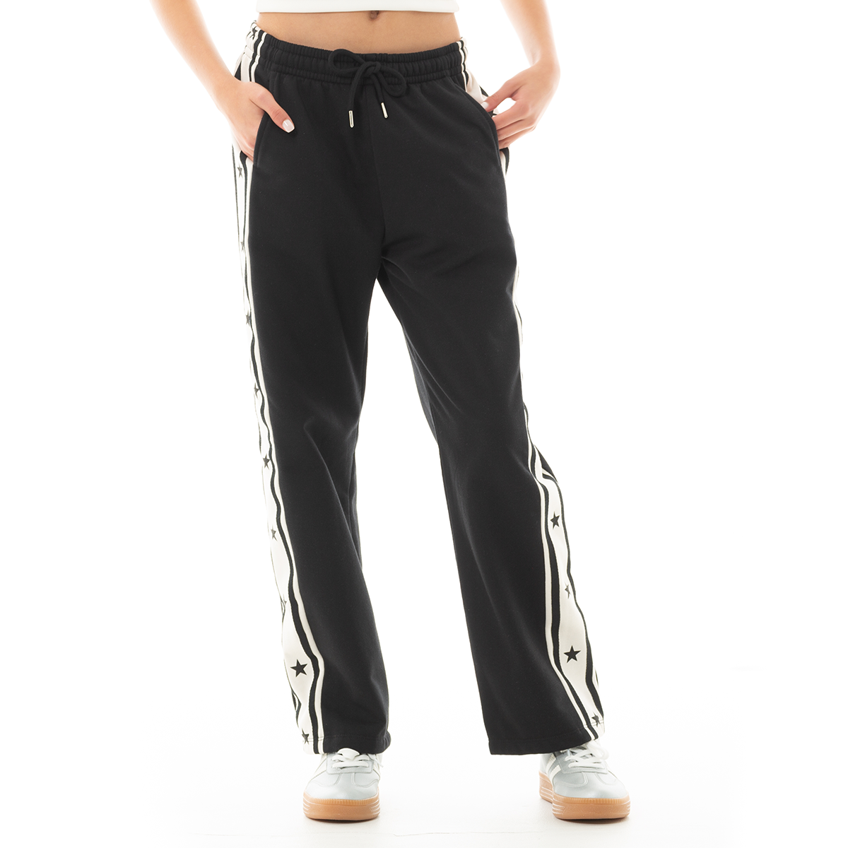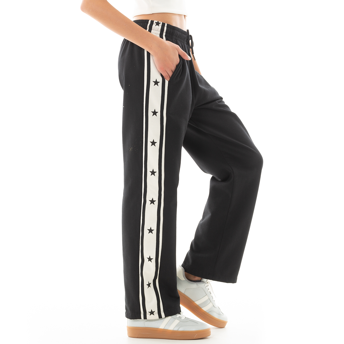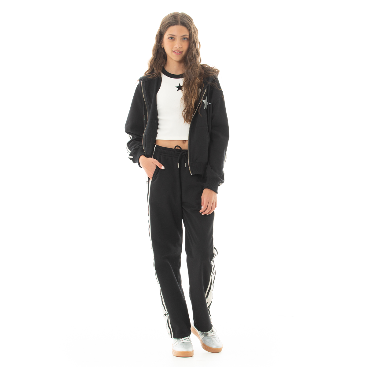 These black joggers combine comfort with a sporty-cool vibe. Designed with contrast side stripes and star appliqué details, they bring a bold and modern touch to everyday looks. Soft, cozy and easy to style—perfect for girls who love statement basics.