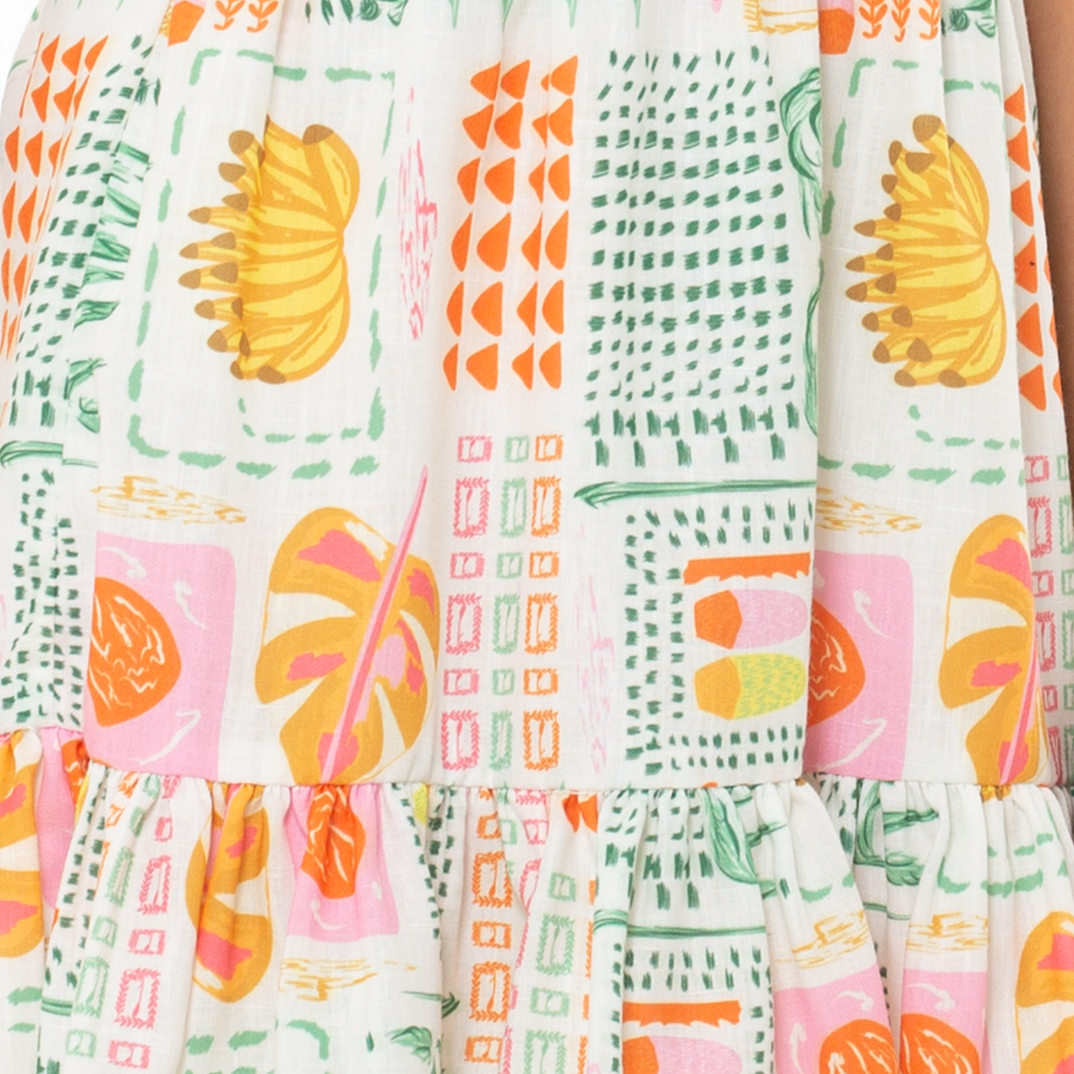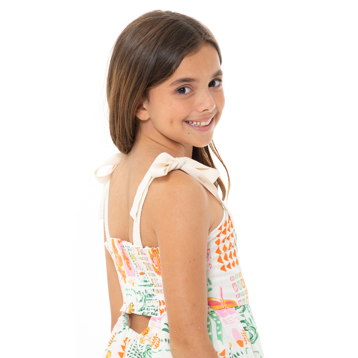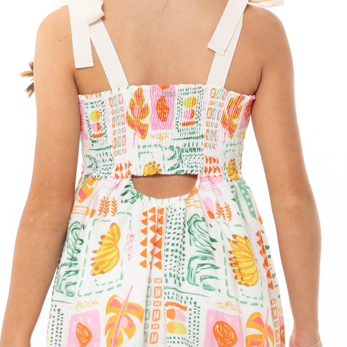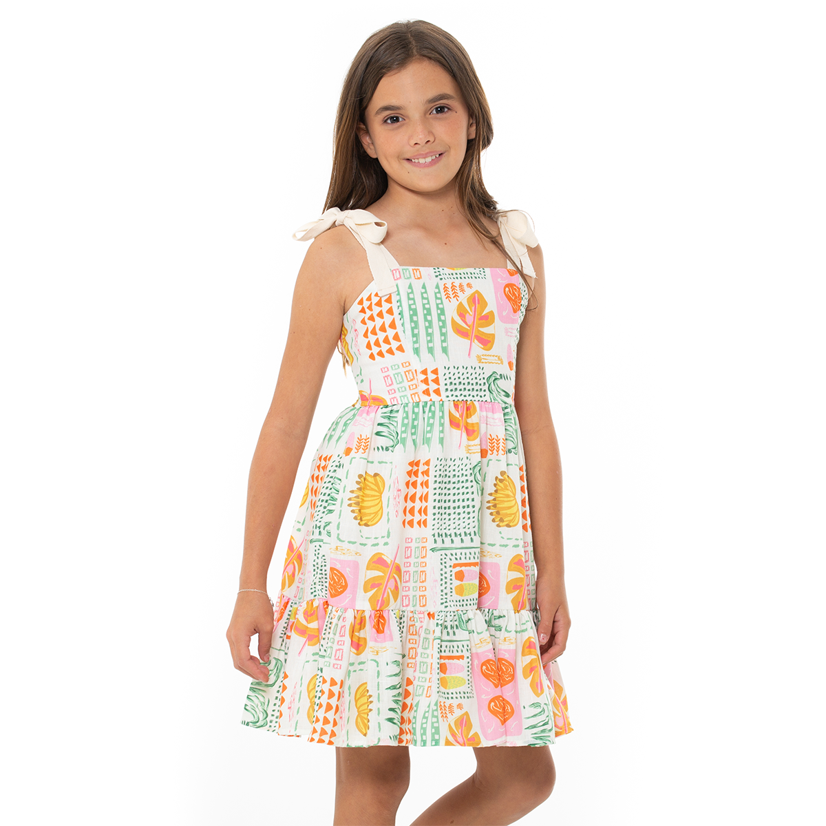 Fresh, playful and full of color, this dress is made to brighten her summer days. With a fun tropical-inspired print and charming details, it’s the perfect blend of comfort and style.