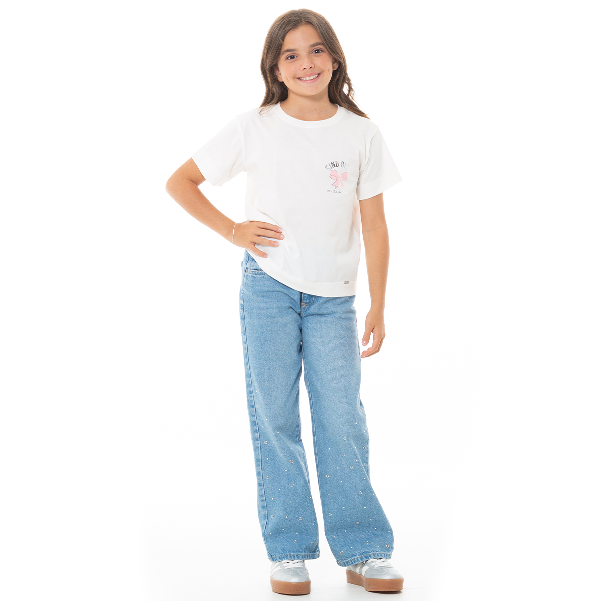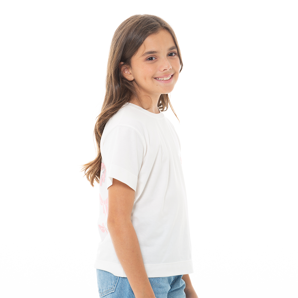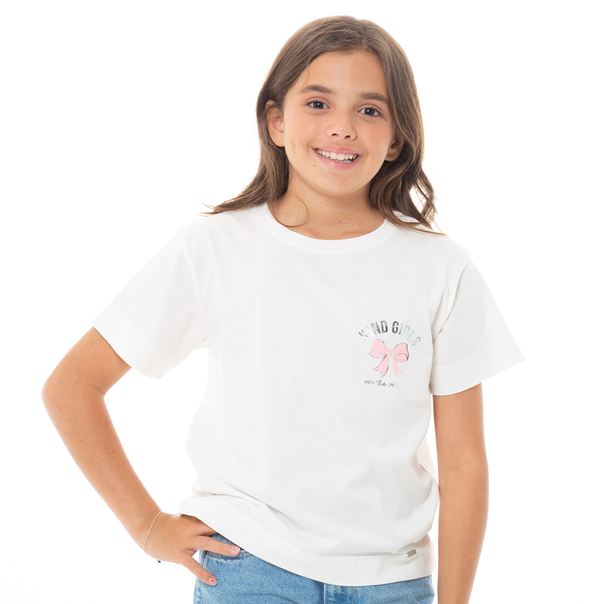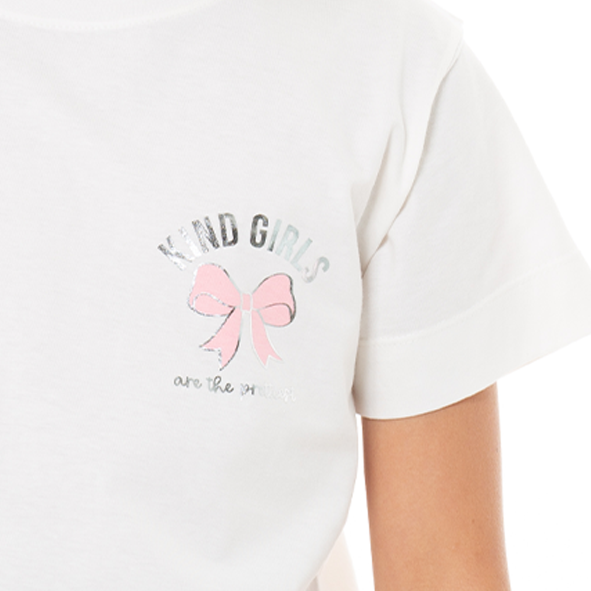 White "Kind Girls" T-Shirt with Bow Print For Girls