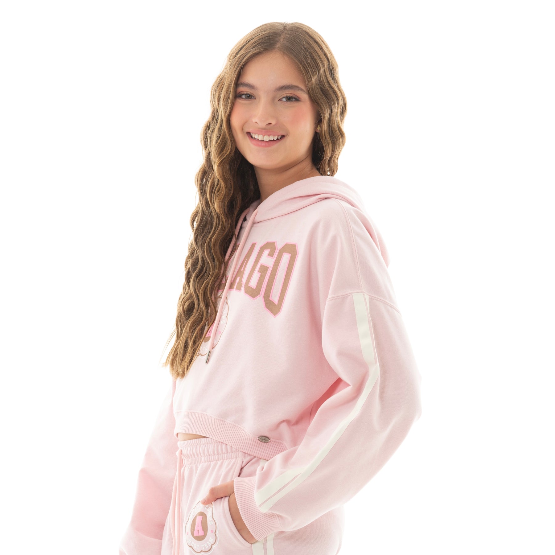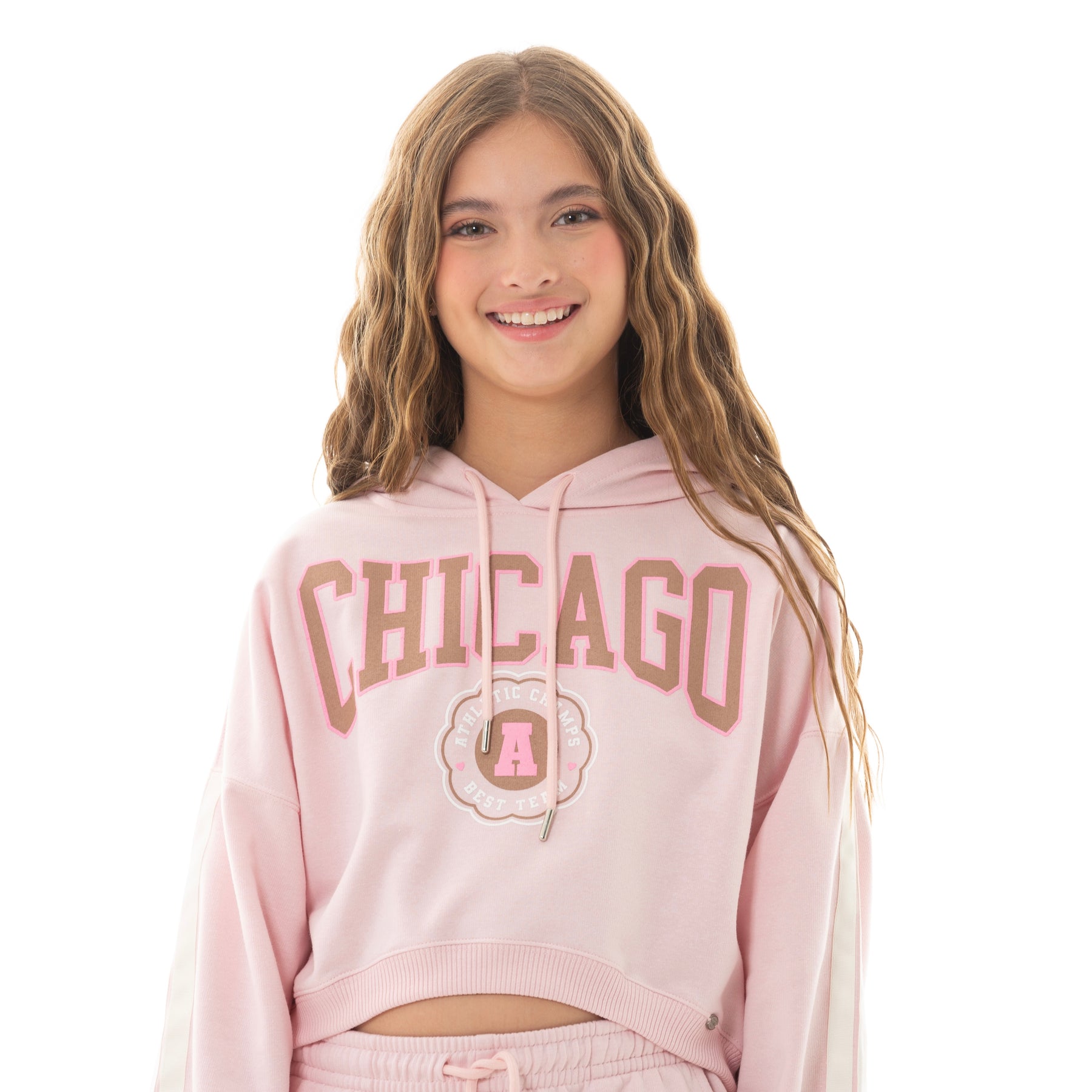 Sporty and trendy pink hoodie for girls with CHICAGO lettering and college-style printed design. Soft inside for cozy comfort and relaxed fit. The elastic waistband gives it a flattering shape, perfect for pairing with her favorite joggers or jeans.