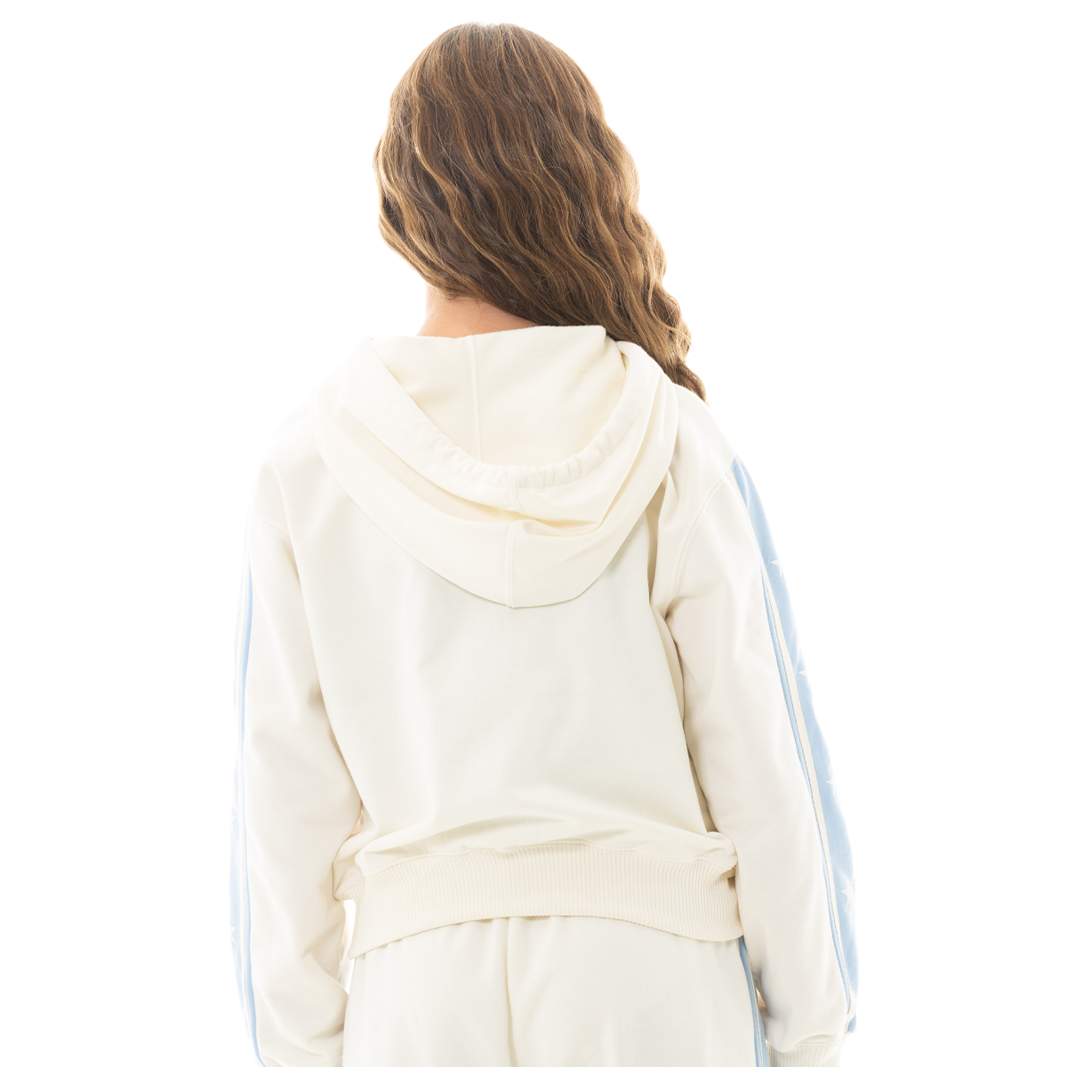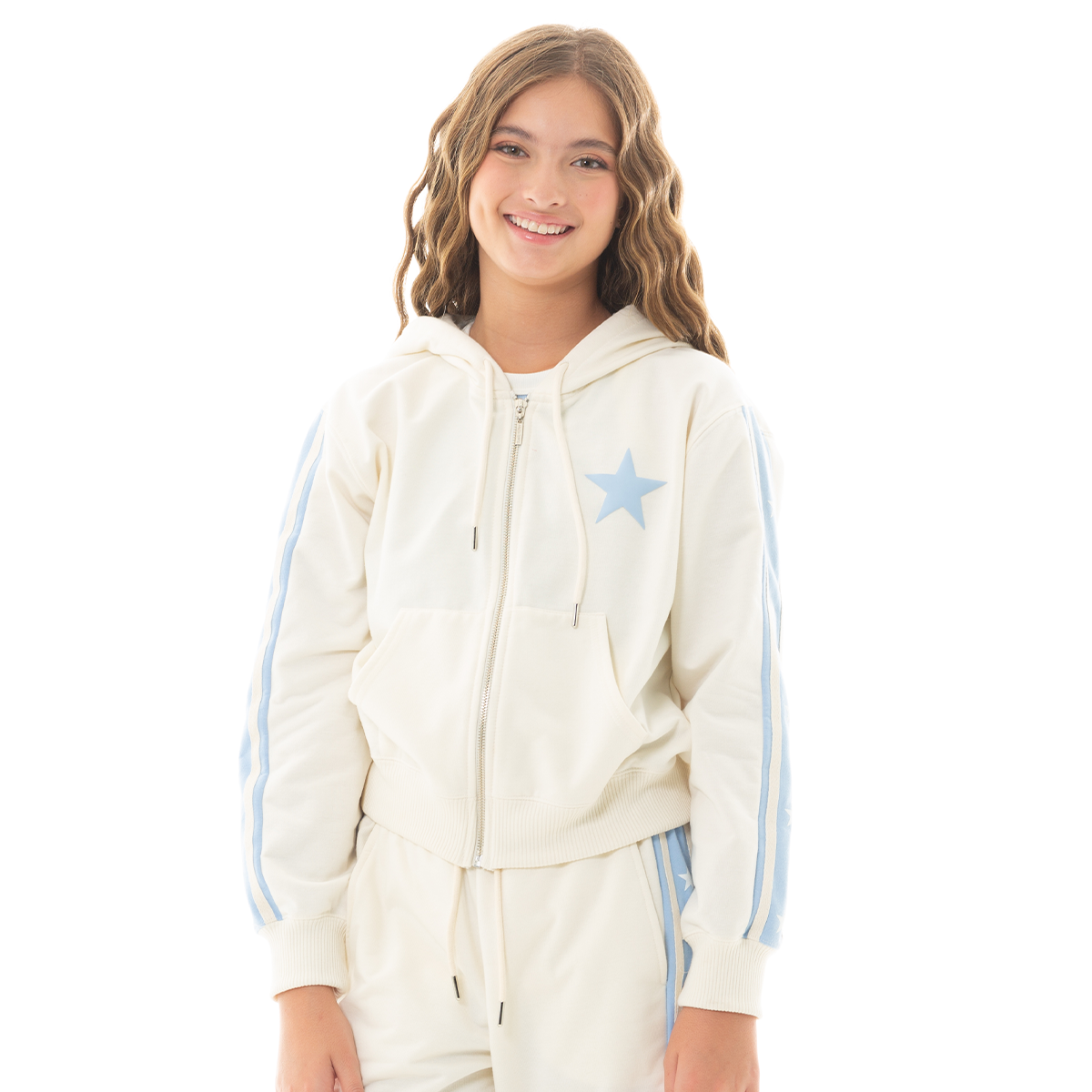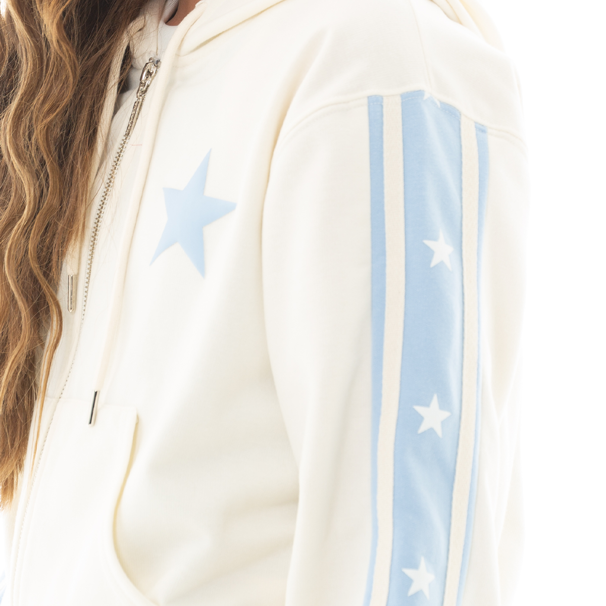 A fresh and sporty hoodie with a soft girl twist. This cream hoodie features pastel blue star patches along the sleeves and a matching star detail on the chest, giving it a standout but delicate varsity look. Made from a cozy cotton–poly blend, it’s warm, comfortable, and perfect for everyday wear.