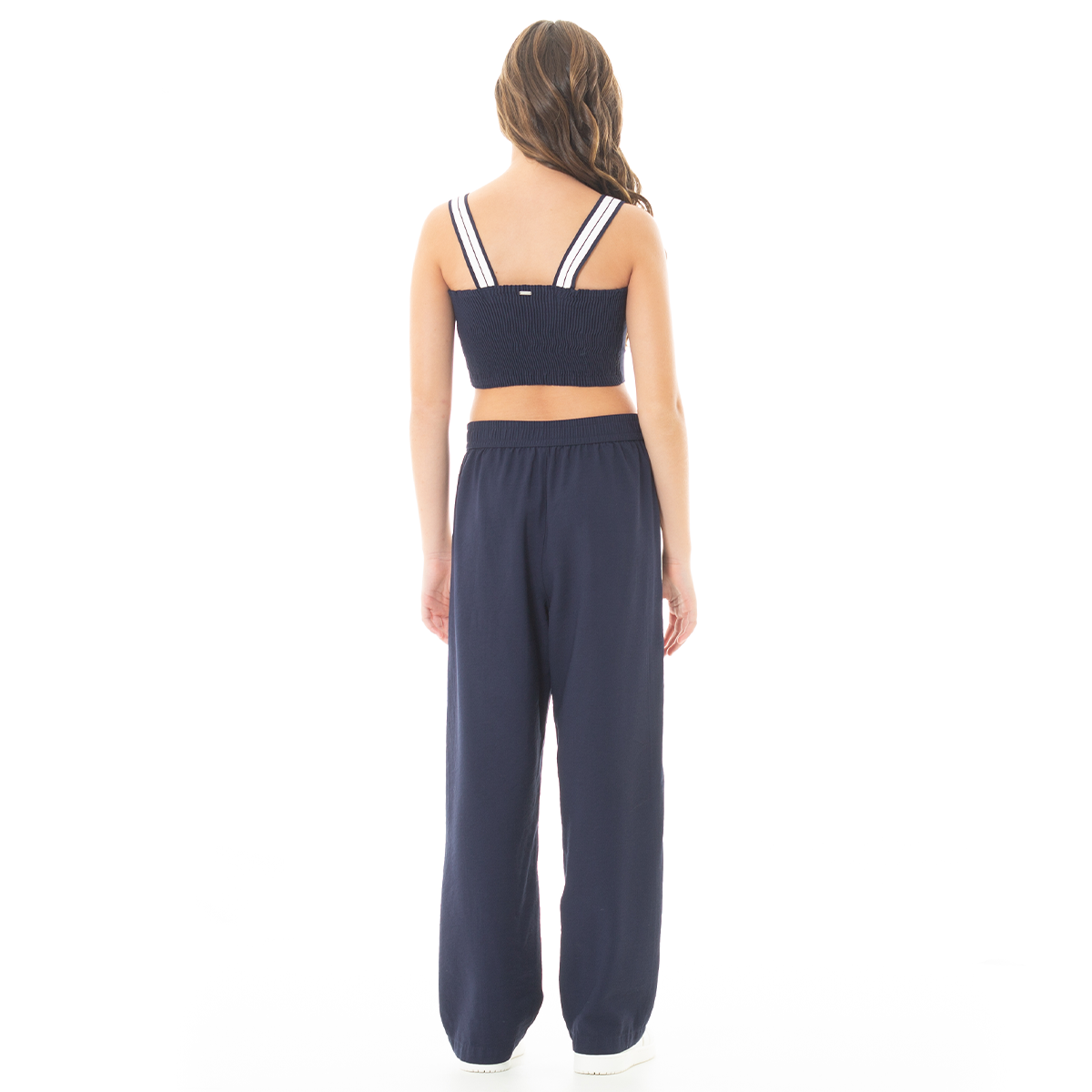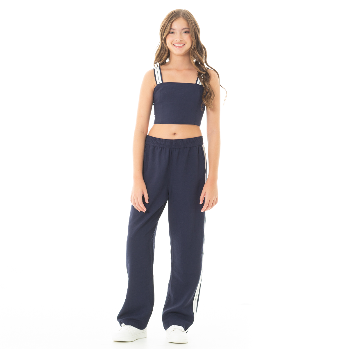 Sporty, chic, and made for movement! This two-piece set includes a smocked crop top with double straps and wide-leg jogger pants with contrast side stripes. Designed for comfort and style, it’s the ultimate outfit for active days or laid-back weekends.