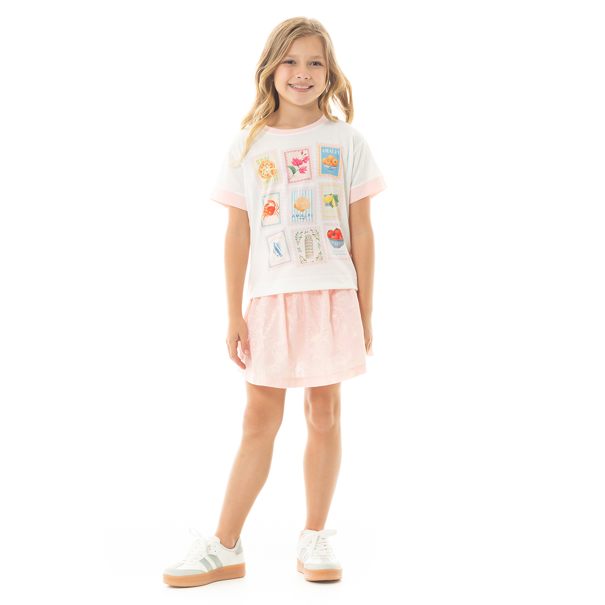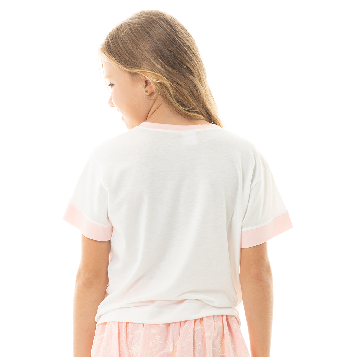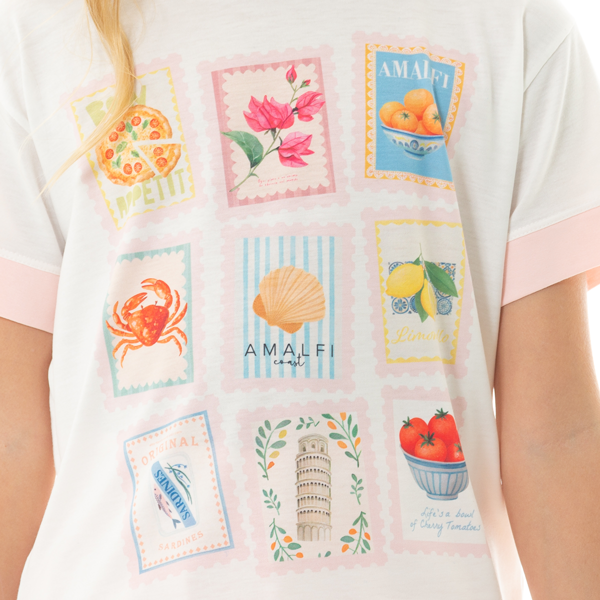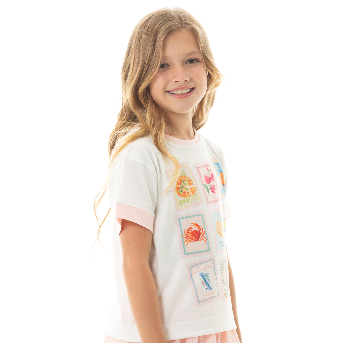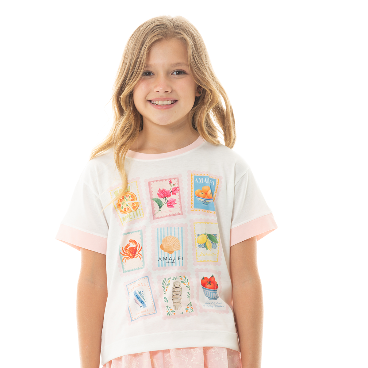 Add a splash of fun to her day with this soft cotton tee featuring a playful postcard-inspired graphic design in pastel tones. The pink cuff details add a sweet, girly touch — perfect for everyday adventures.