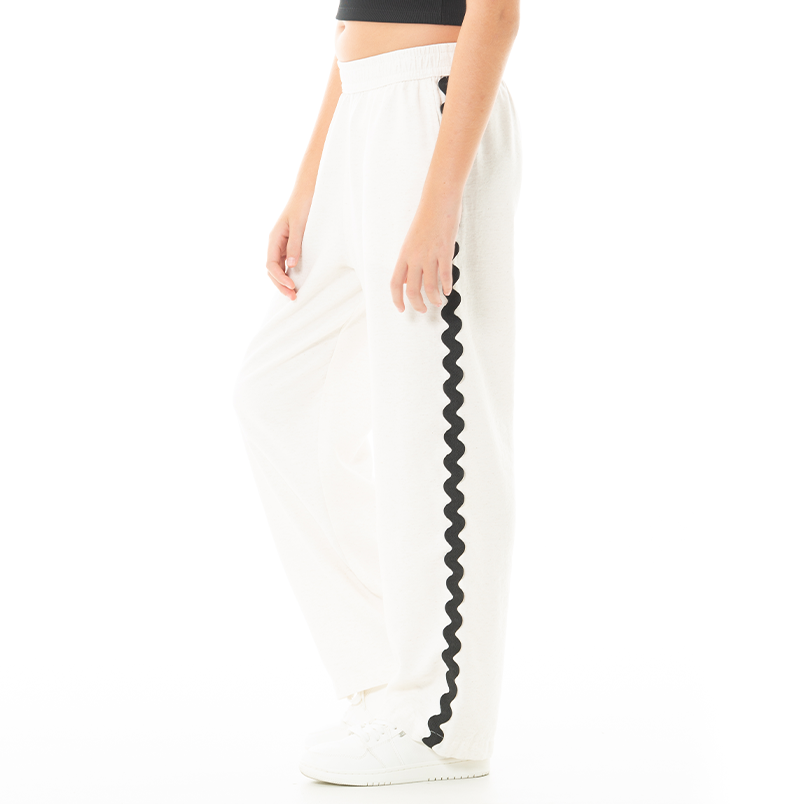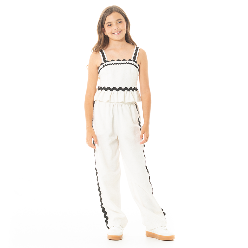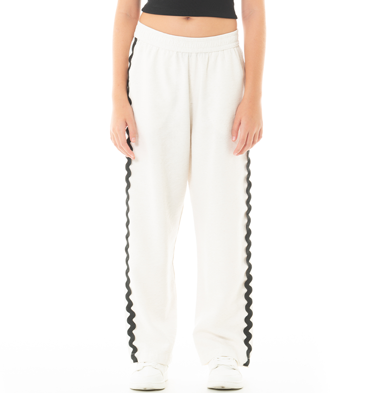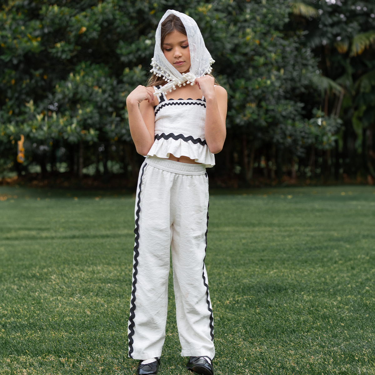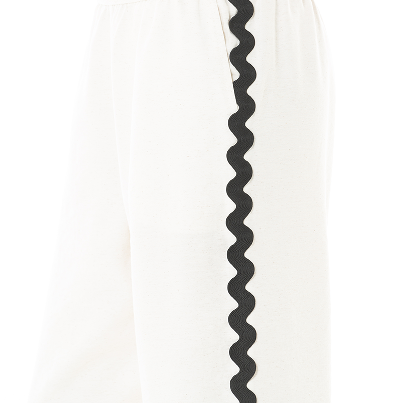 Chic and flowy wide-leg pants for girls, crafted in a soft cream fabric with a subtle speckled texture that adds a natural look. Designed with elegant black wavy trim on the sides, these pants combine comfort and effortless style — a perfect balance between trendy and timeless.