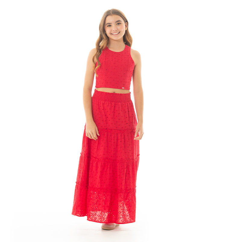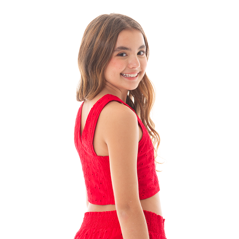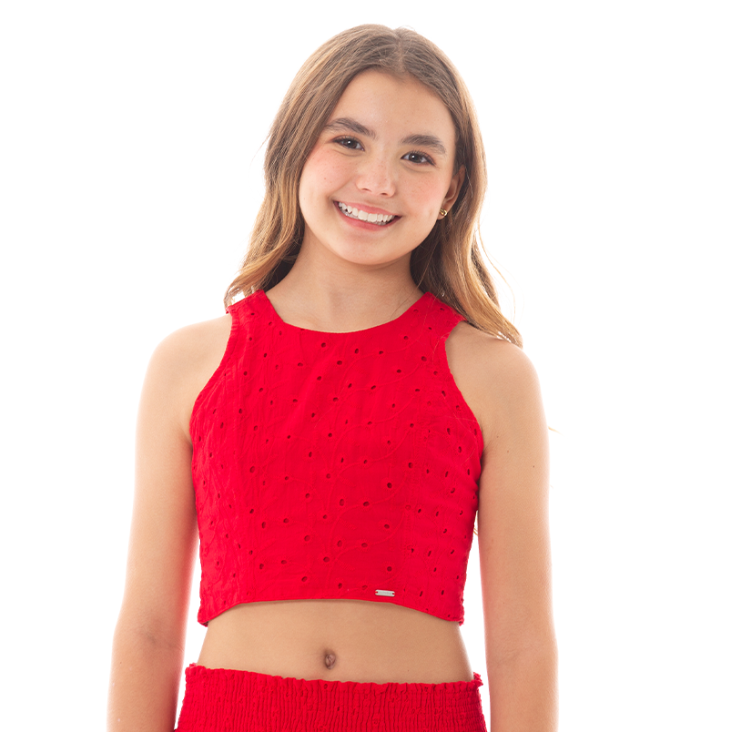 Bright, fun, and full of confidence — this red eyelet crop top brings a stylish pop of color to her look. Designed with a flattering high neckline and a fitted cropped cut, it’s both modern and comfortable.