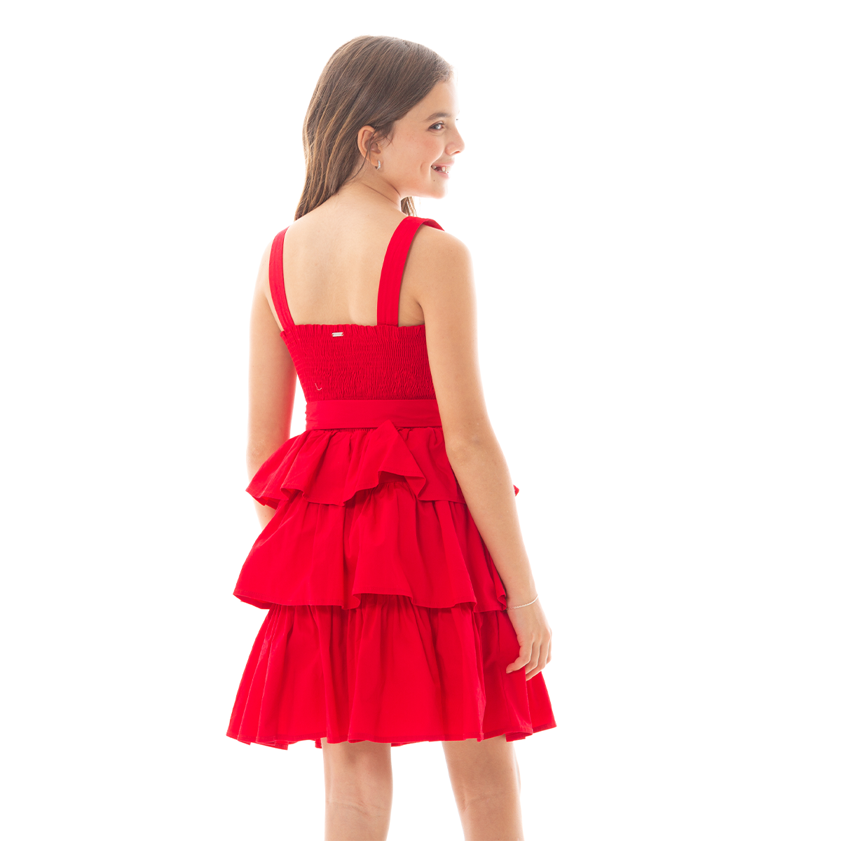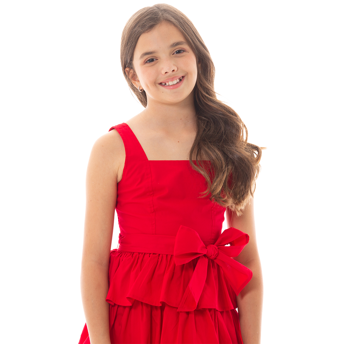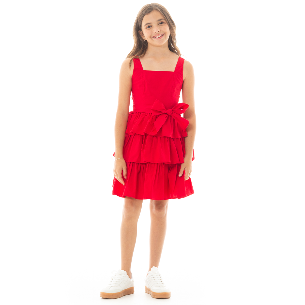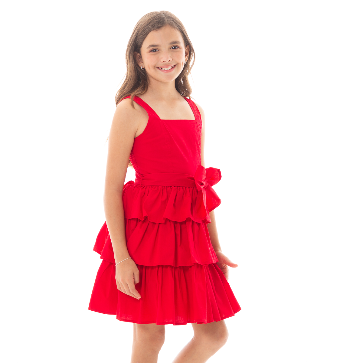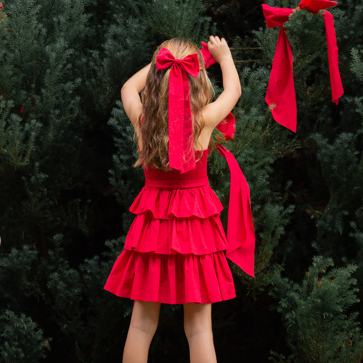 Bring a pop of color and style to her look with this adorable red dress for girls. Featuring layered ruffles and a side bow detail, it’s perfect for adding a fun and elegant touch to any special day. The smocked back ensures a comfortable fit while the square neckline gives it a timeless charm.