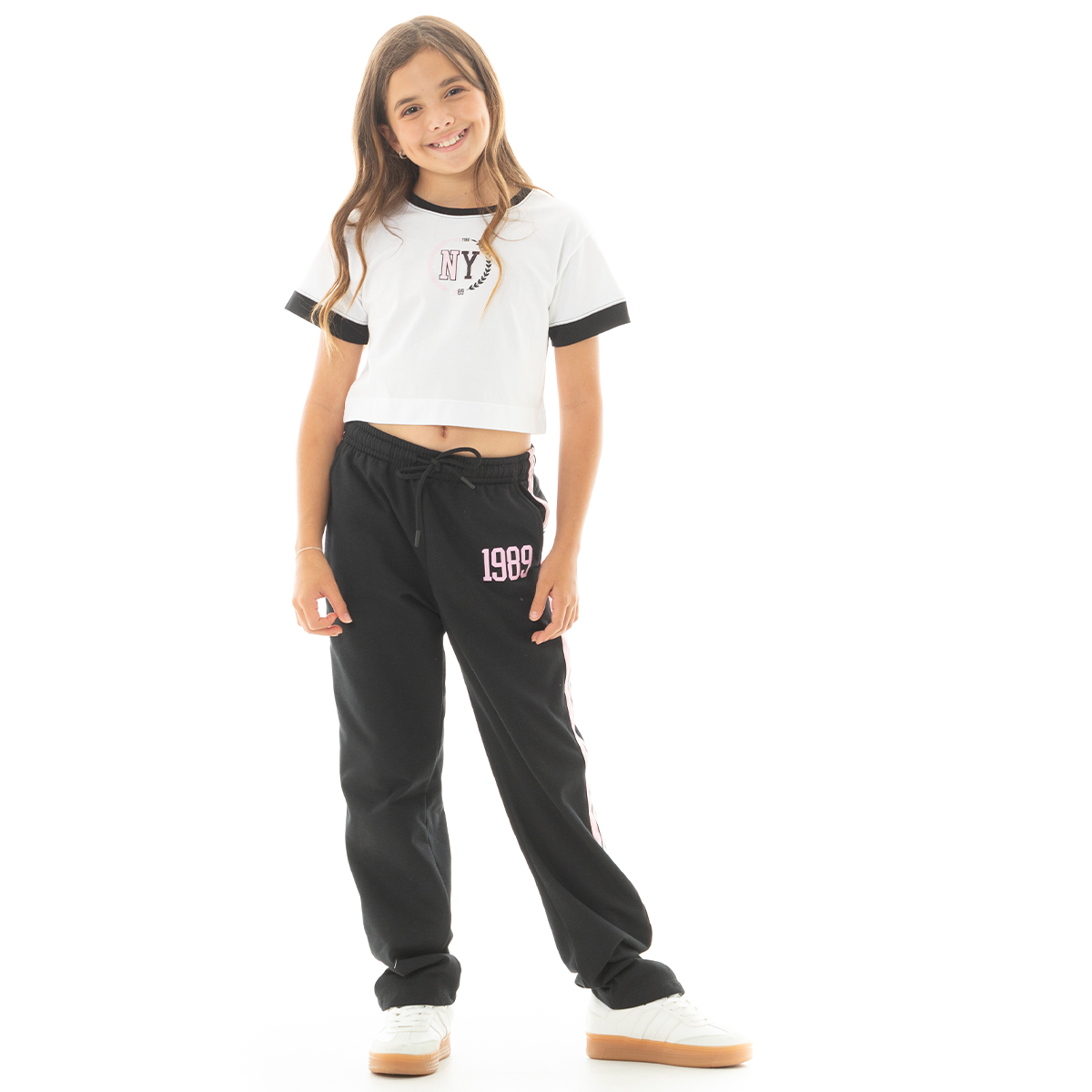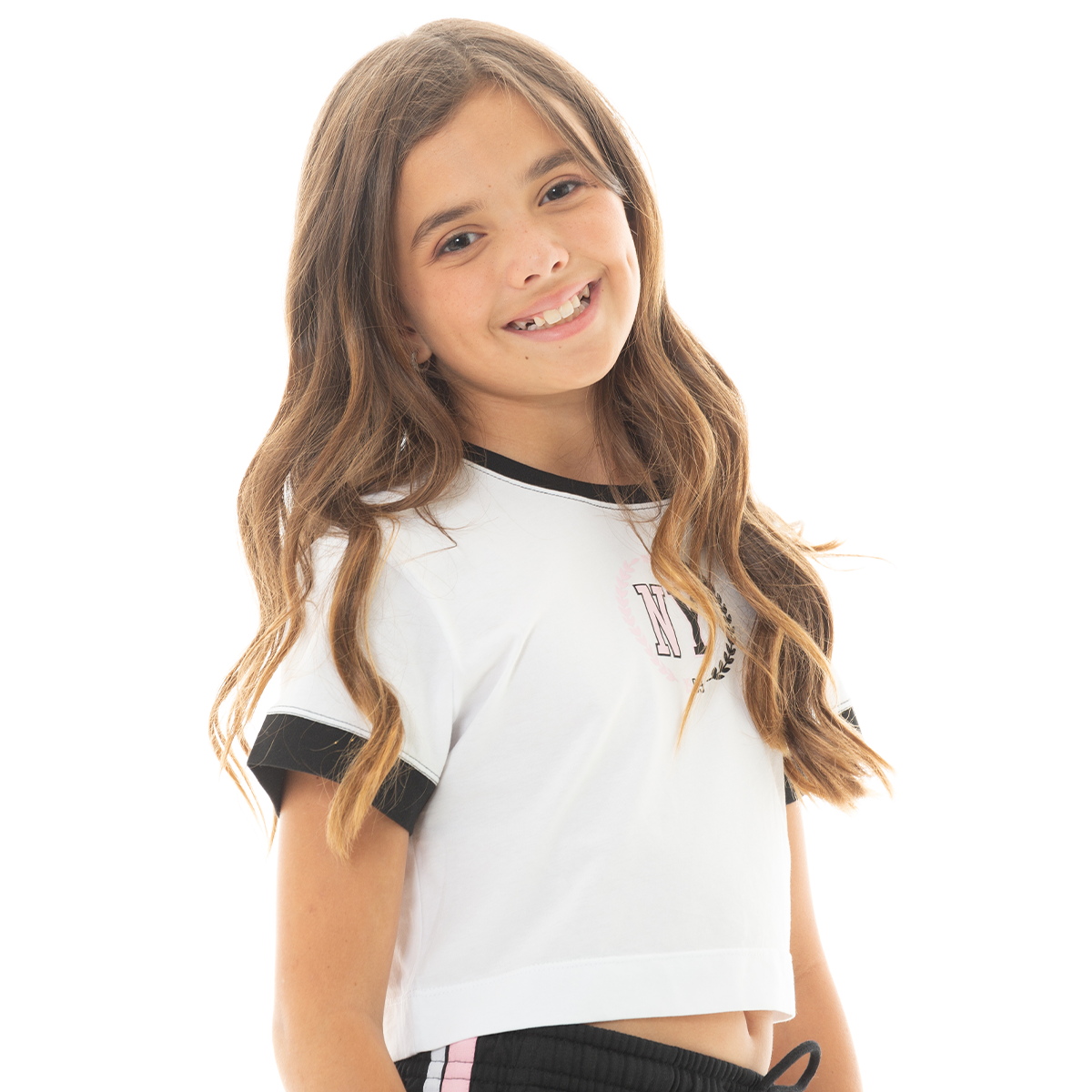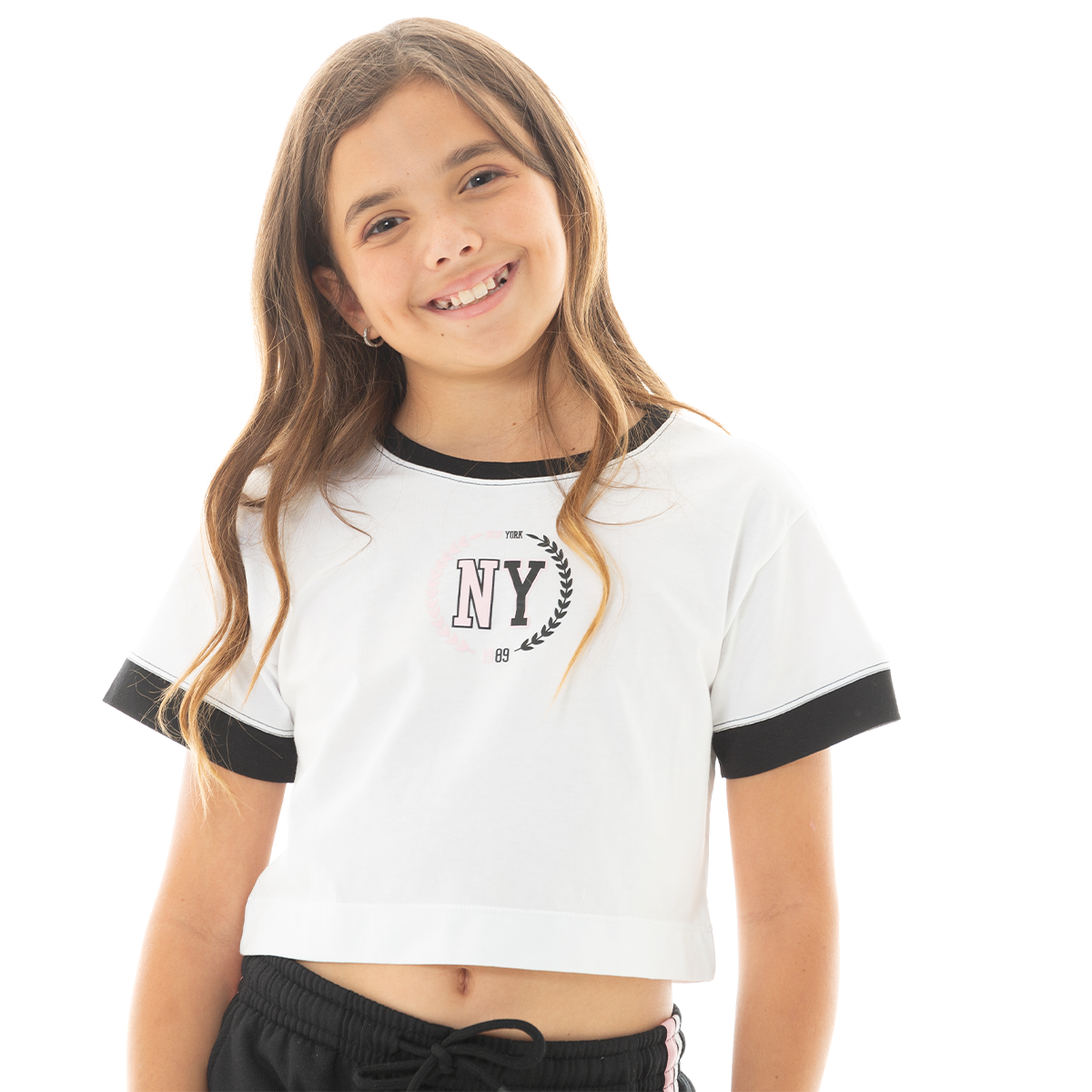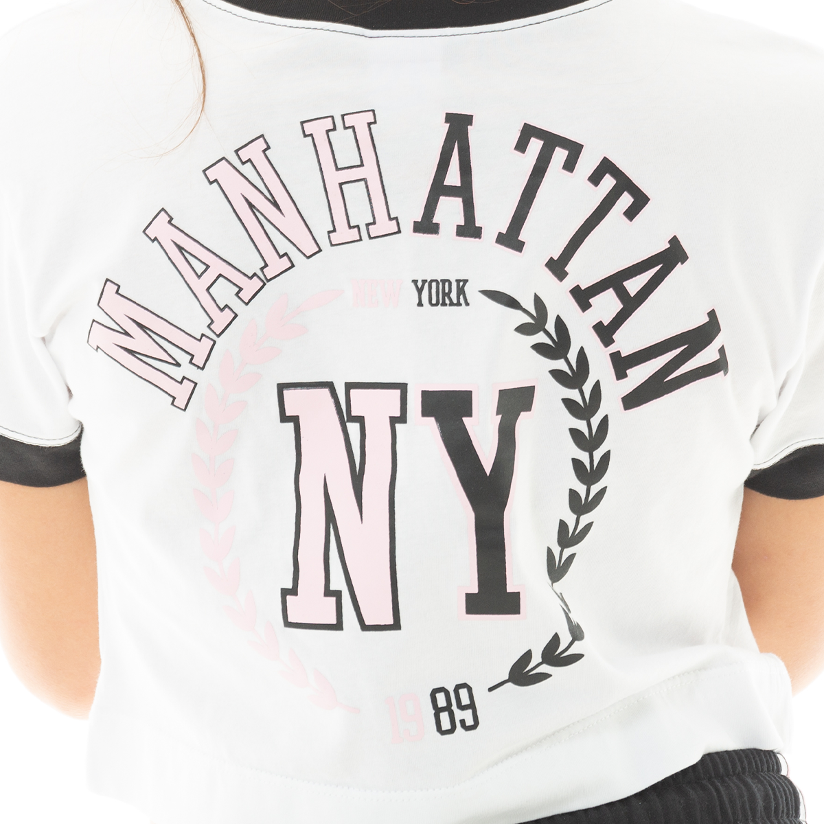 Sporty and trendy, this white crop top with black trim features a bold NY Manhattan graphic on the front and back. A versatile piece that can be worn solo or layered for a full streetwear look.
