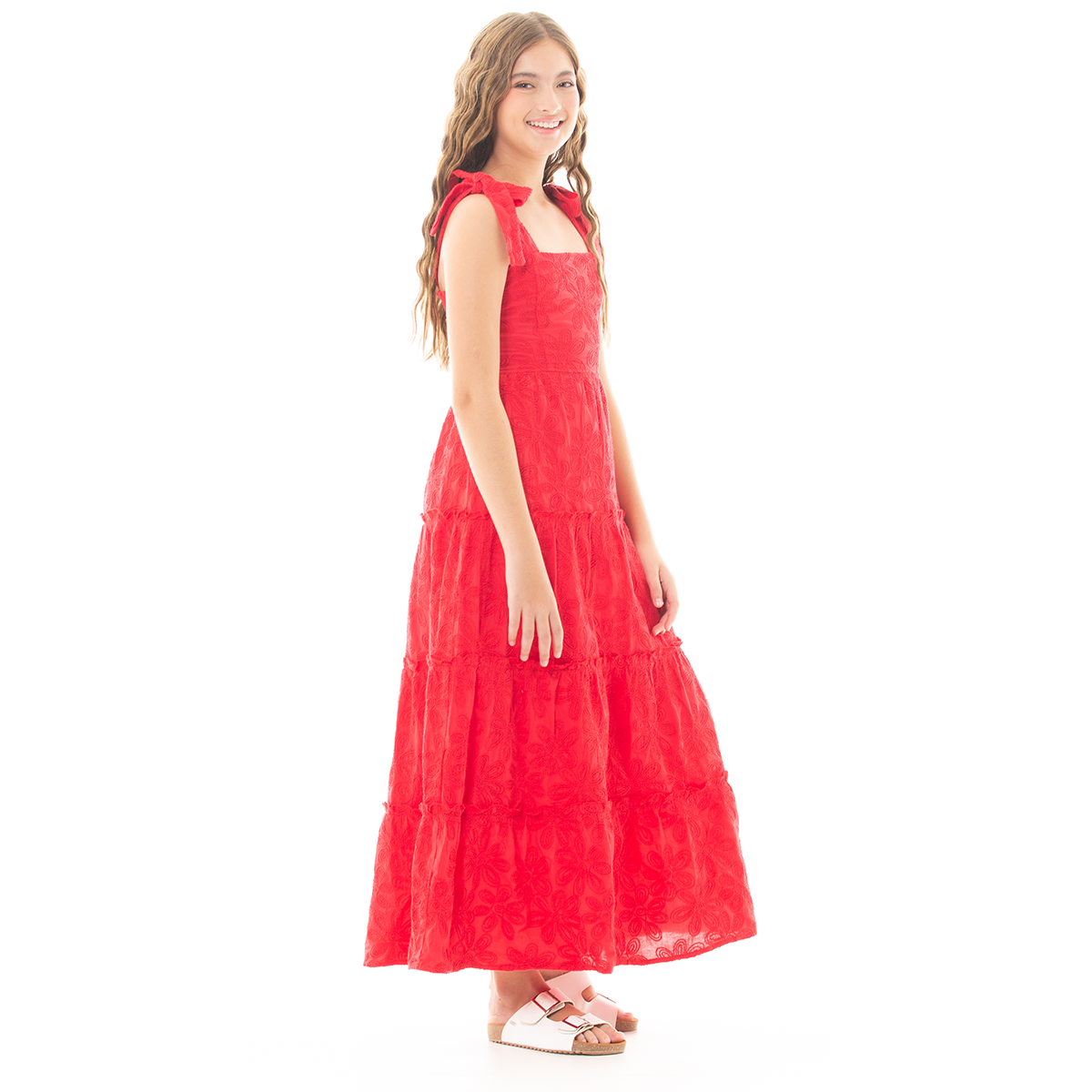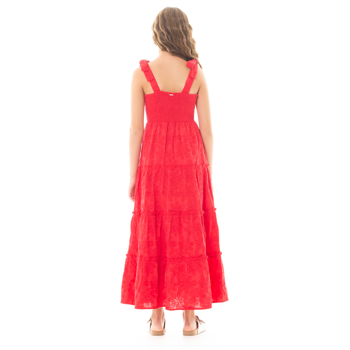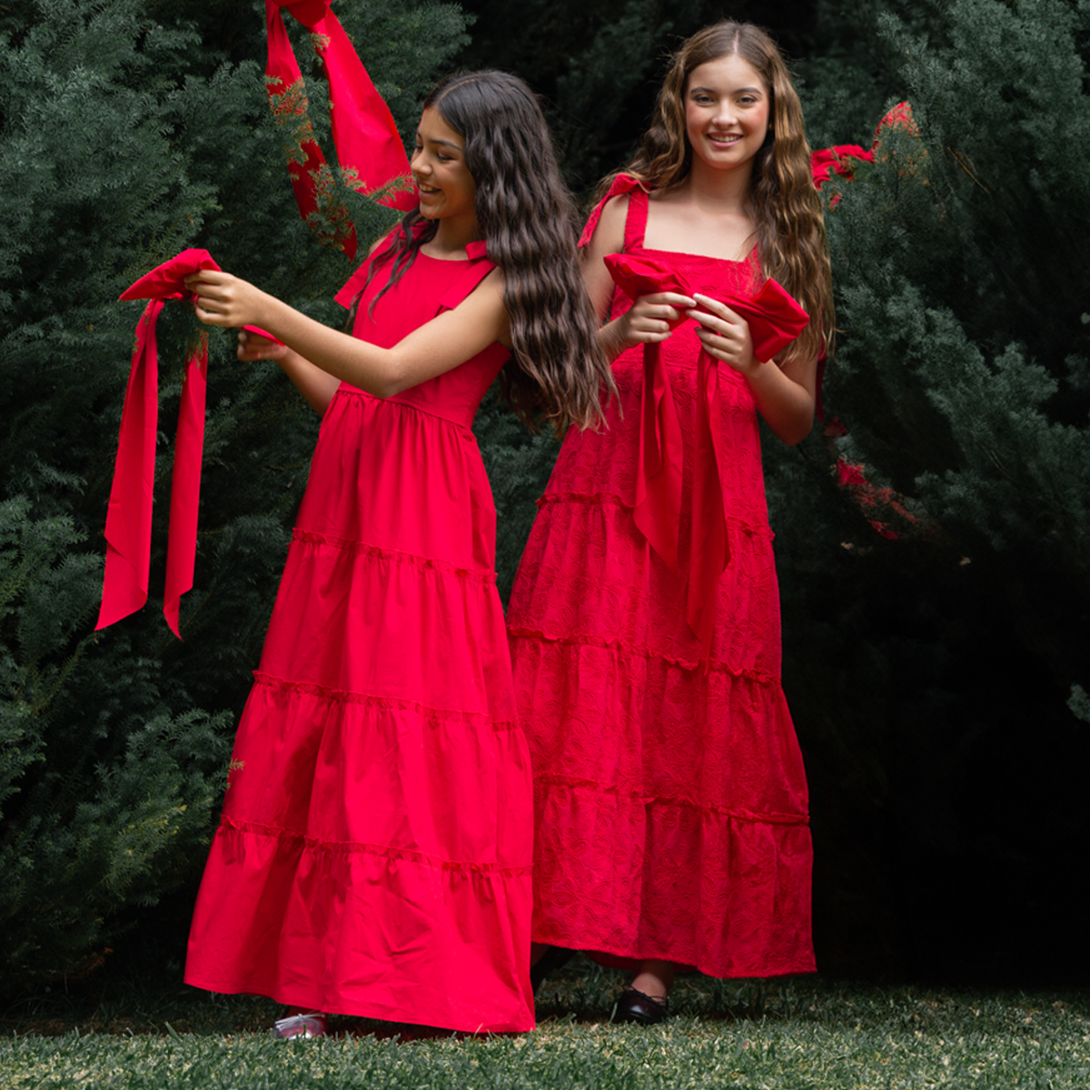 A romantic and elegant red maxi dress designed to make her stand out. Crafted in a soft textured fabric with bow straps and a tiered silhouette, this piece brings movement, charm, and effortless style to any special moment.