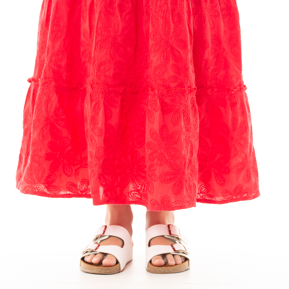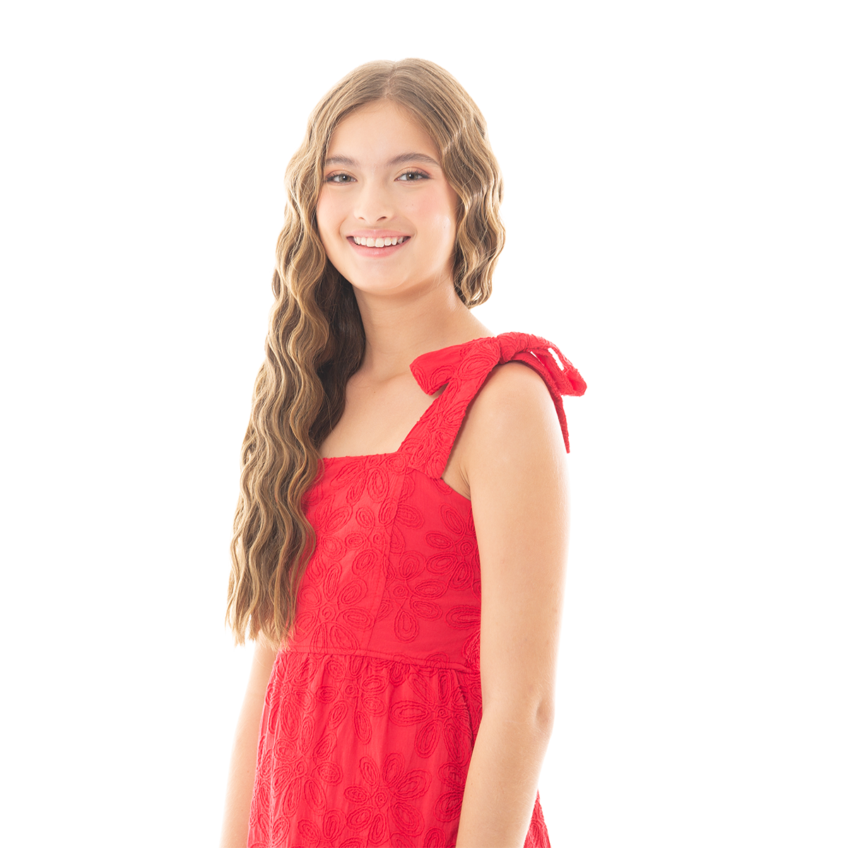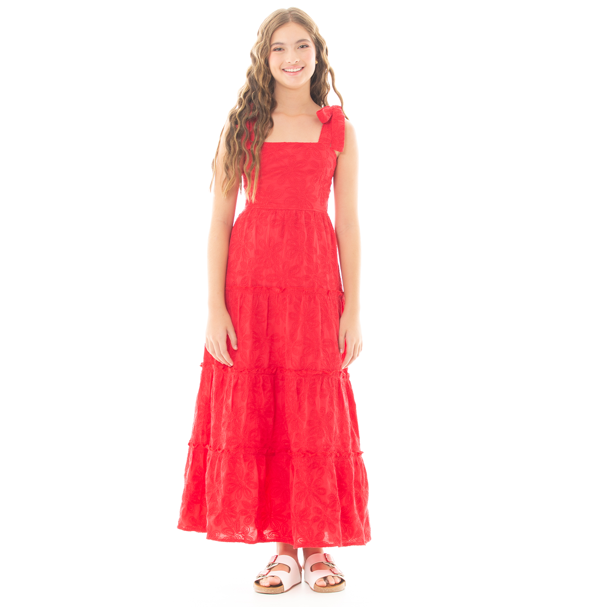 A romantic and elegant red maxi dress designed to make her stand out. Crafted in a soft textured fabric with bow straps and a tiered silhouette, this piece brings movement, charm, and effortless style to any special moment.