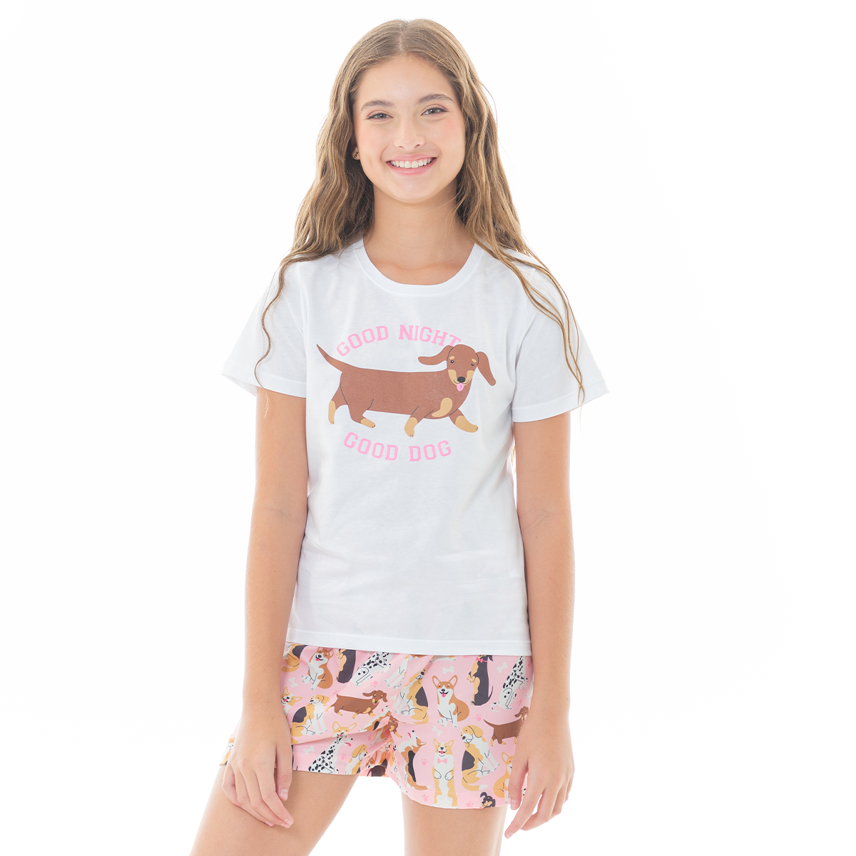 Two-piece pajama set with a relaxed T-shirt and printed shorts featuring a playful dog design.