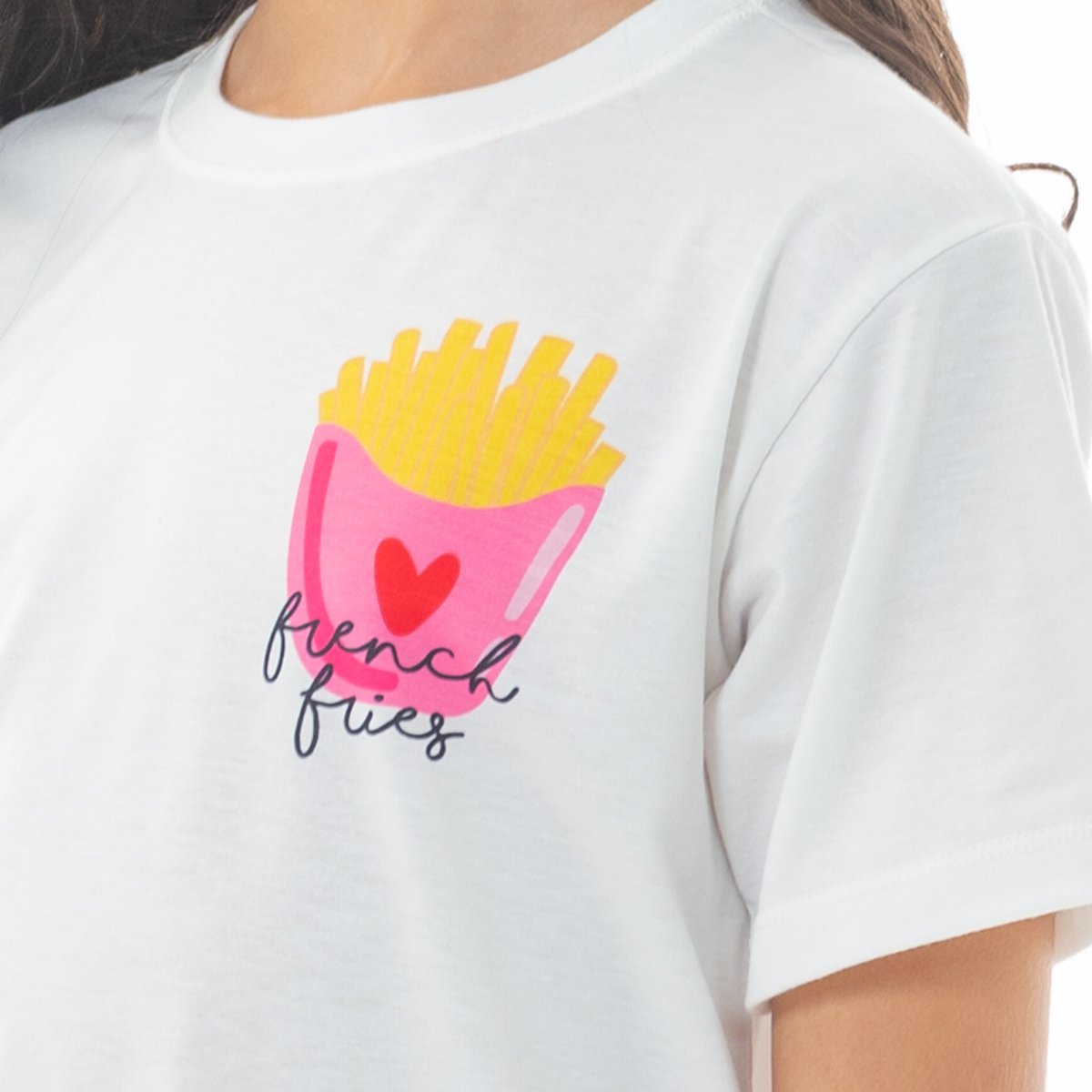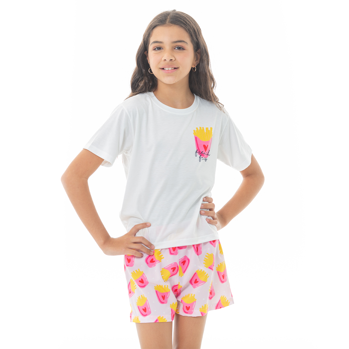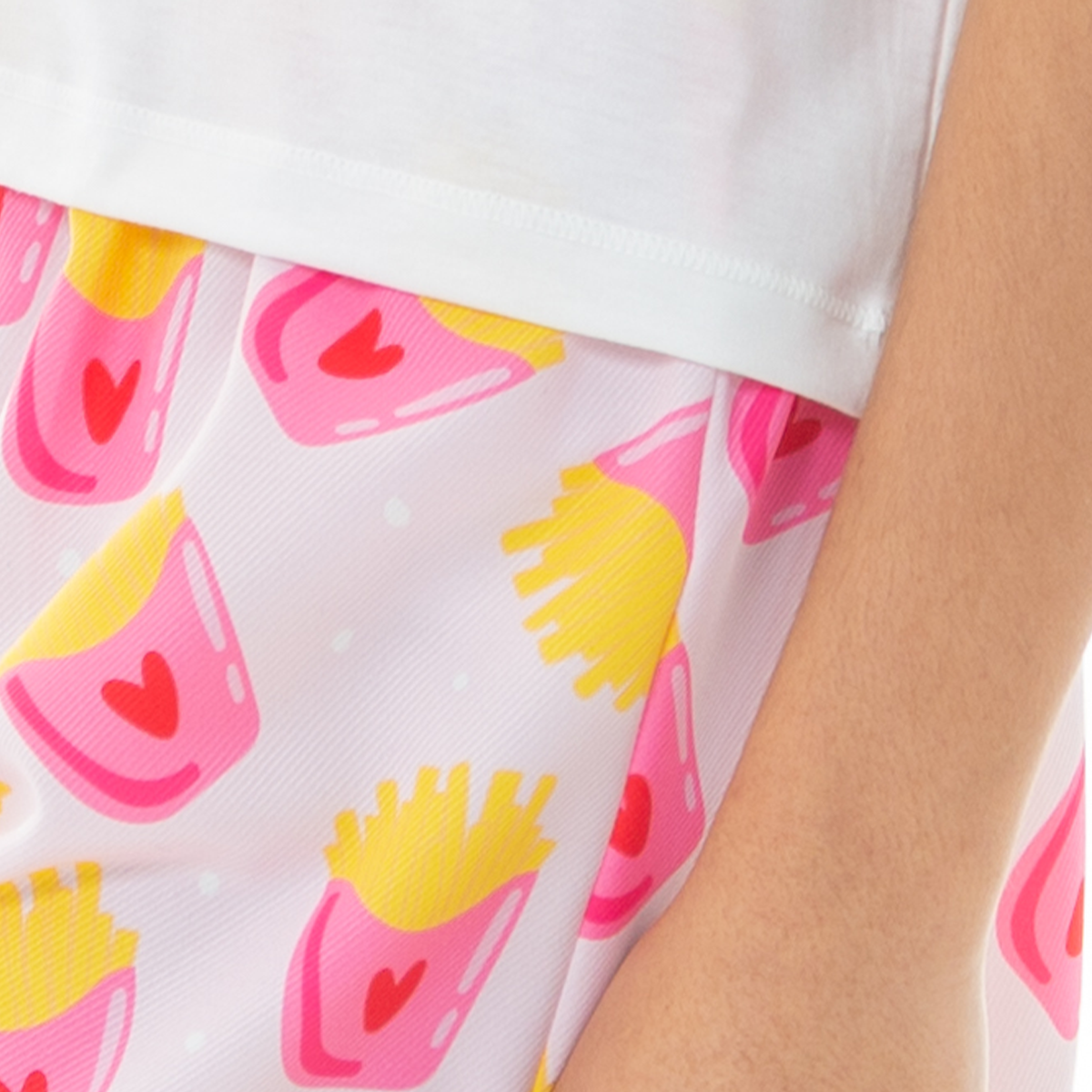 Two-piece pajama set with a cotton T-shirt and printed shorts featuring fries and heart details for a fun and playful look.