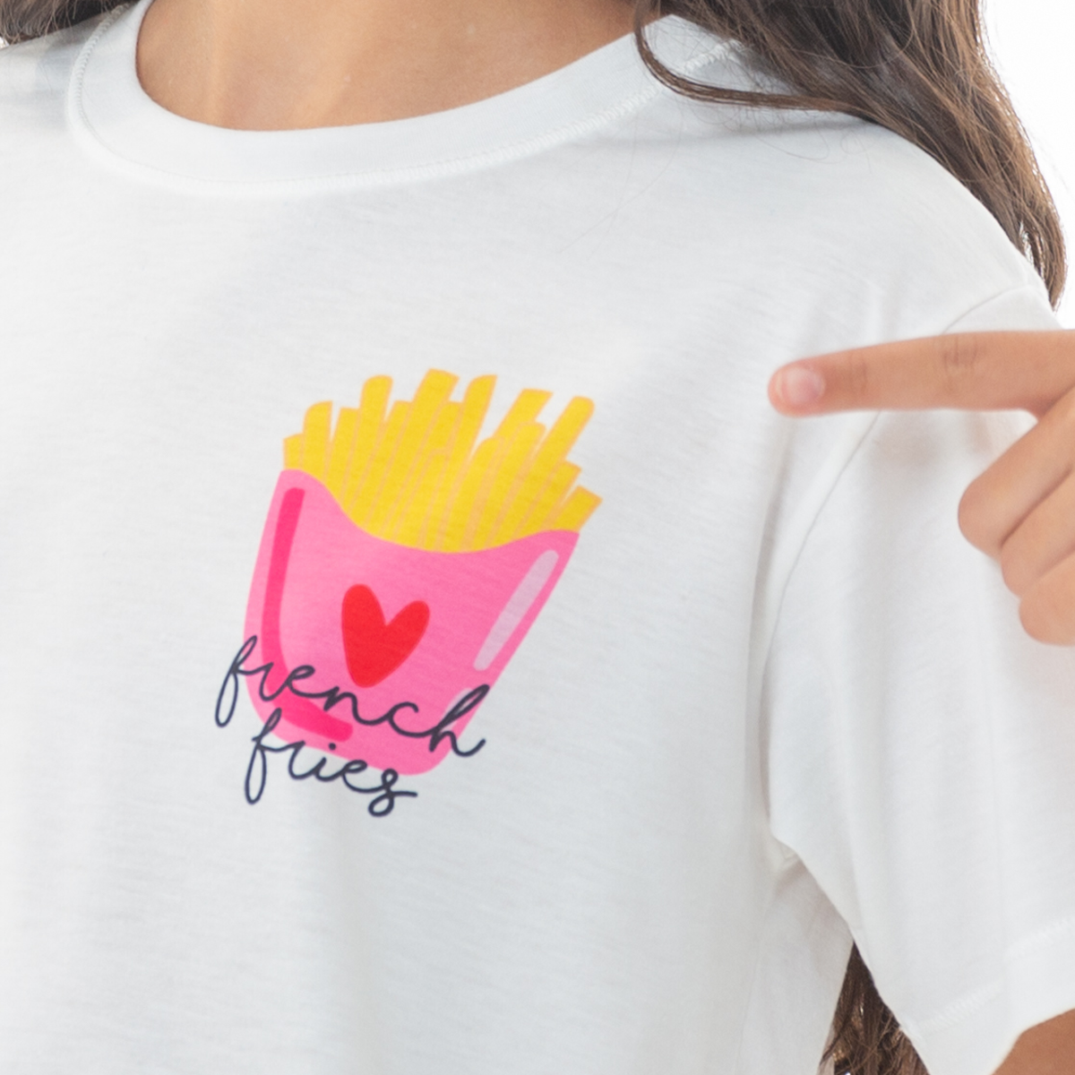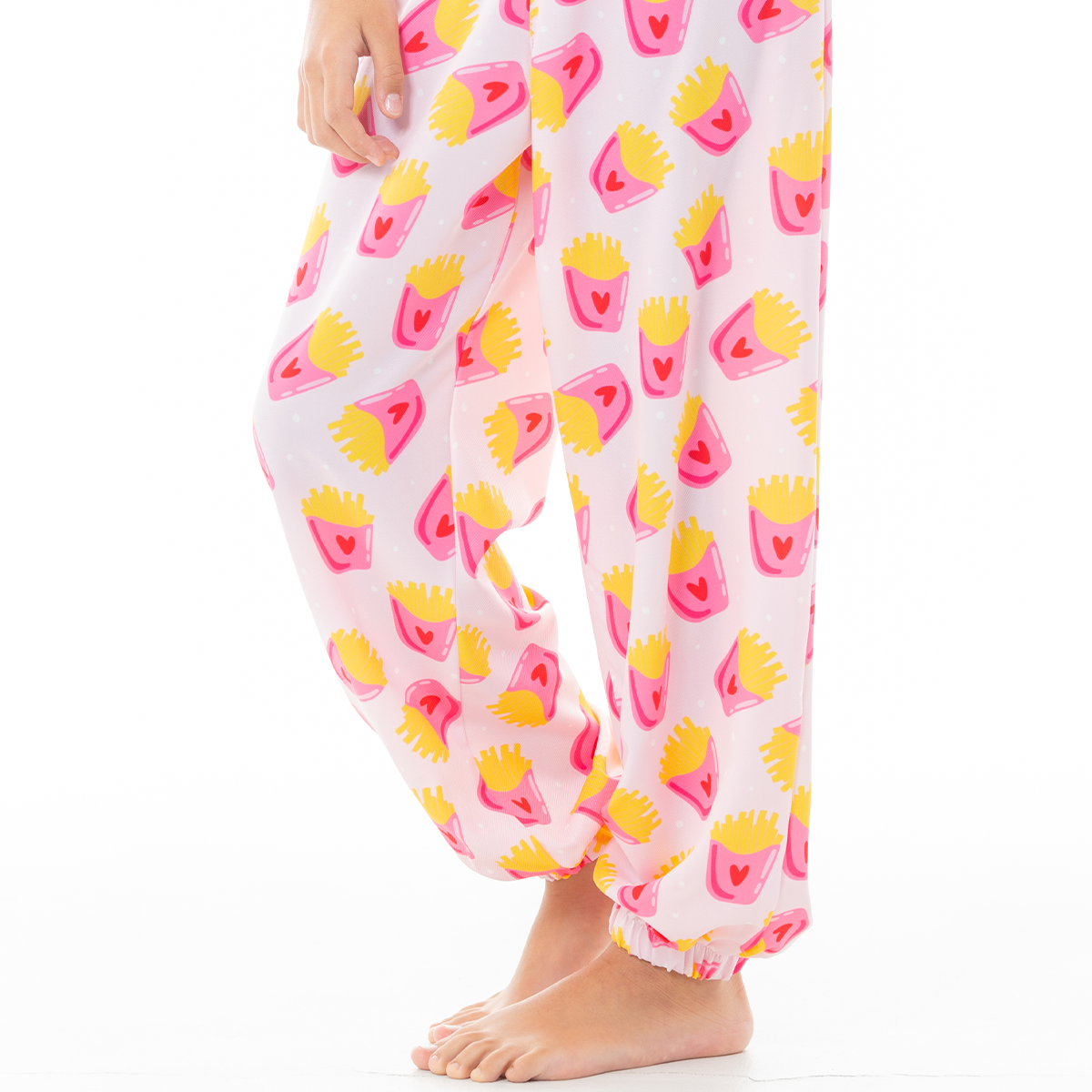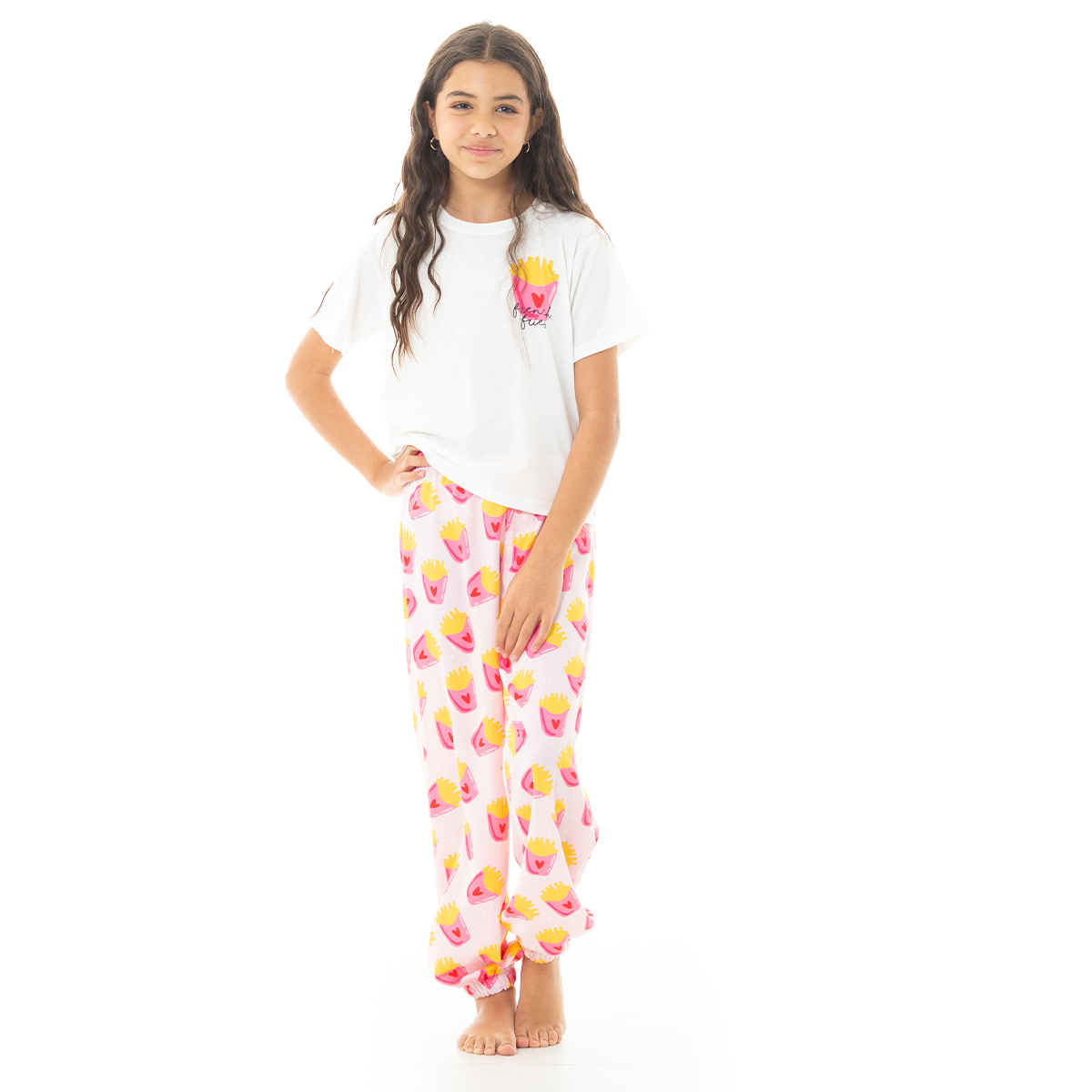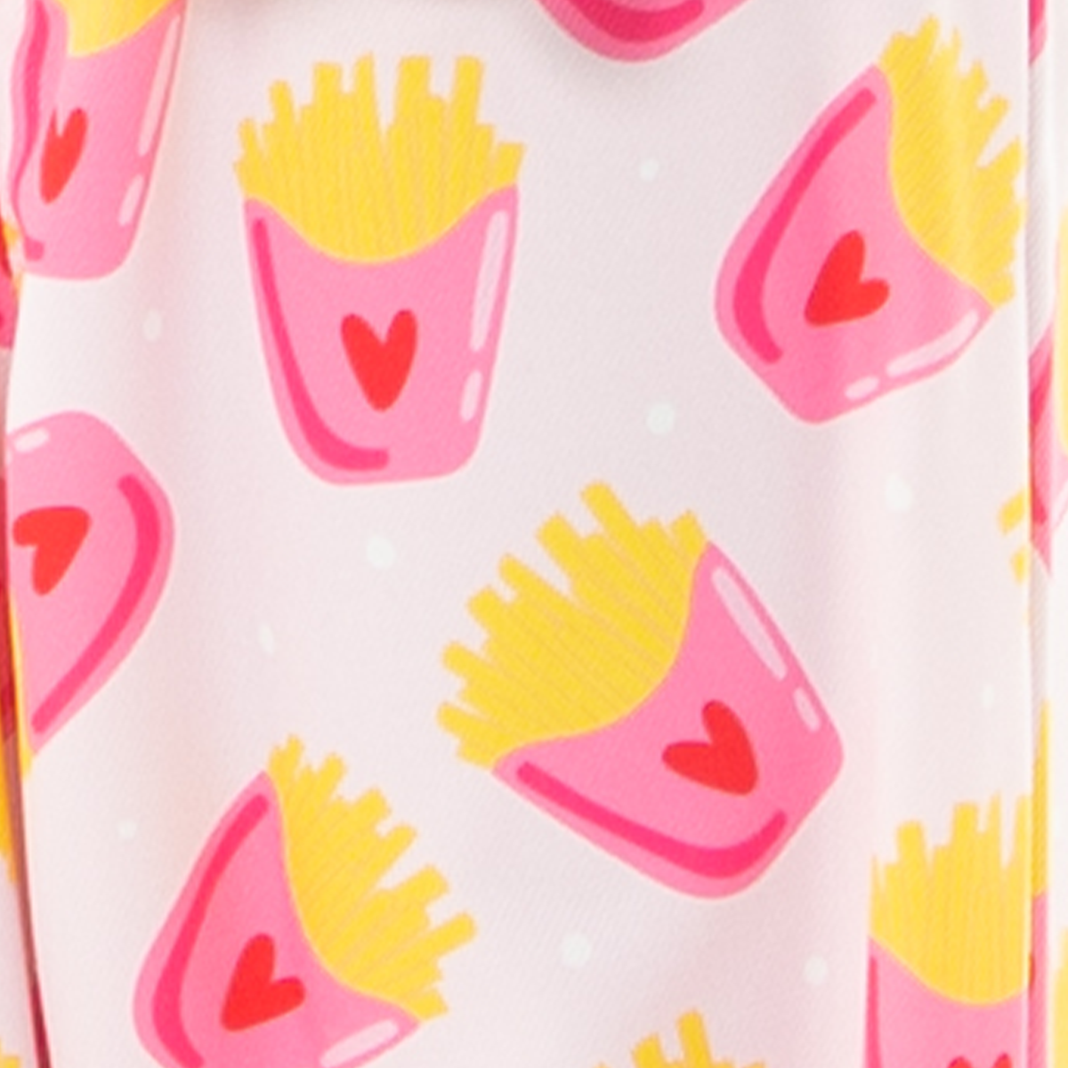 Two-piece pajama set with a cotton T-shirt and printed pants featuring fries and heart details for a fun and playful look.
