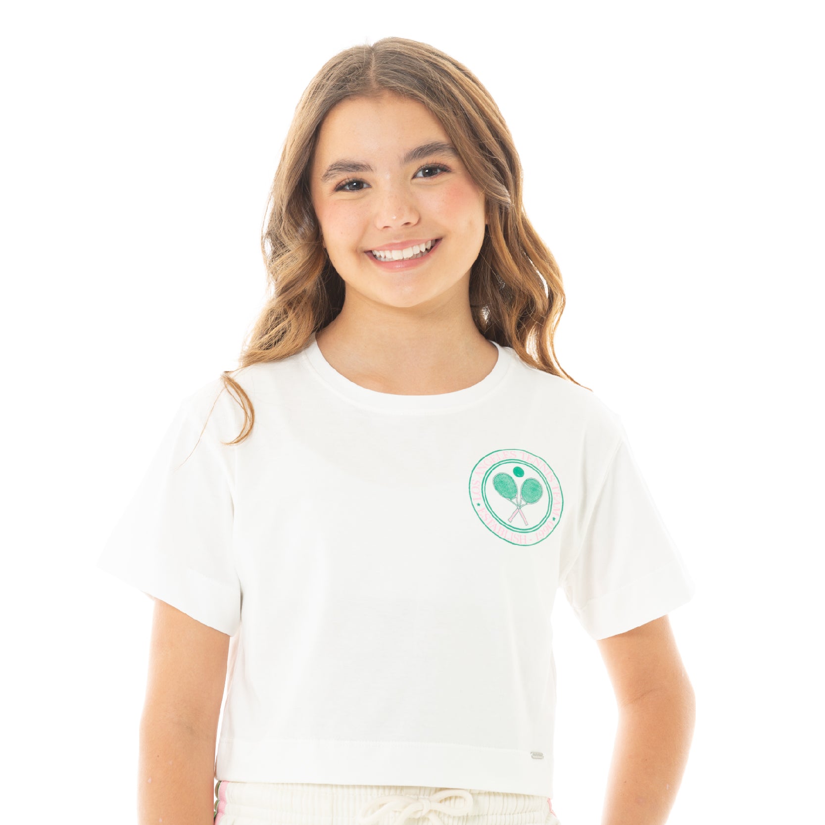 Sporty, fresh, and easy to style — our Girls Tennis Club Graphic Crop Tee is the perfect blend of comfort and trend. Made from 100% cotton, this tee is soft and breathable, ideal for everyday wear. The front features a minimal tennis-inspired graphic with clean varsity-style lines, giving it a sporty-chic look that pairs effortlessly with joggers, denim, skirts, or shorts.