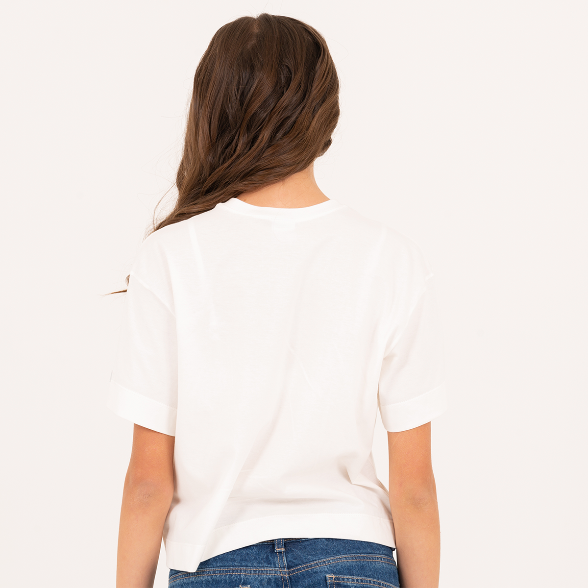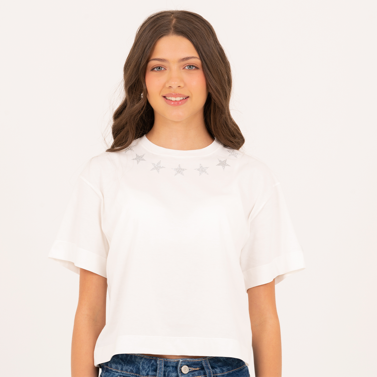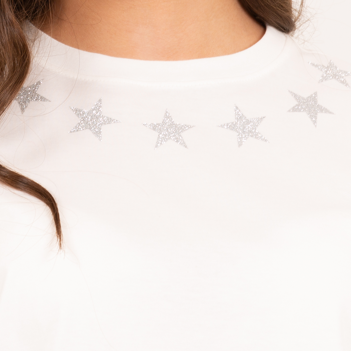 A clean everyday essential with a subtle shine. This white t-shirt features delicate glitter star prints along the neckline, adding a soft sparkle to a timeless silhouette.