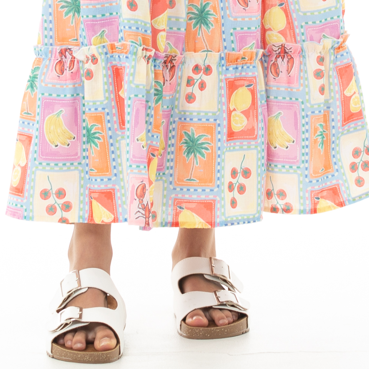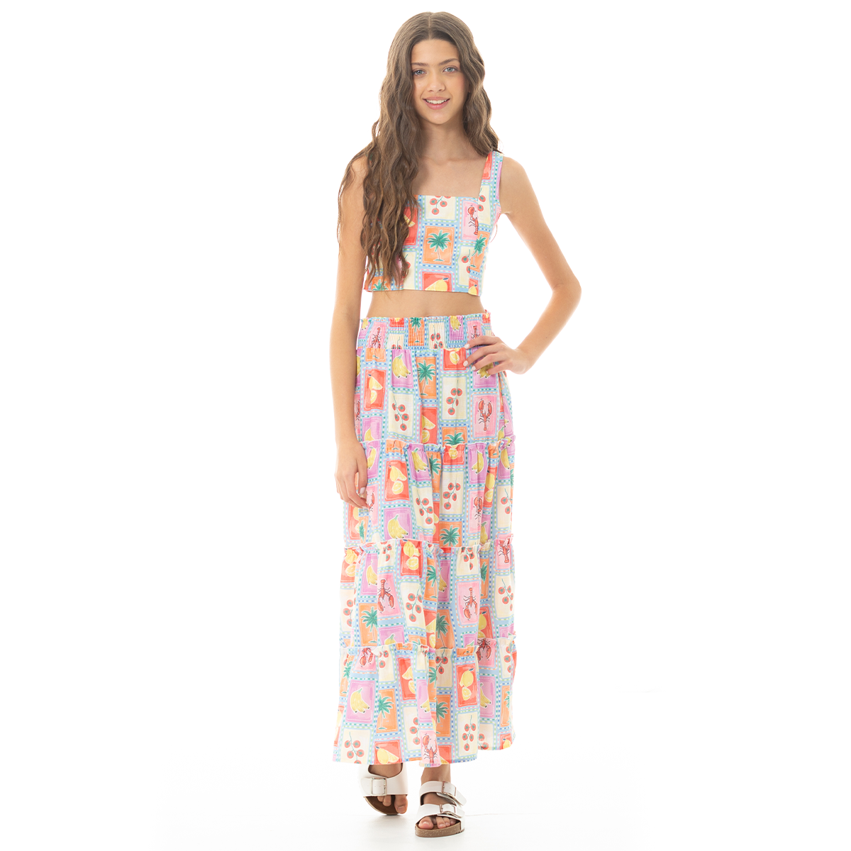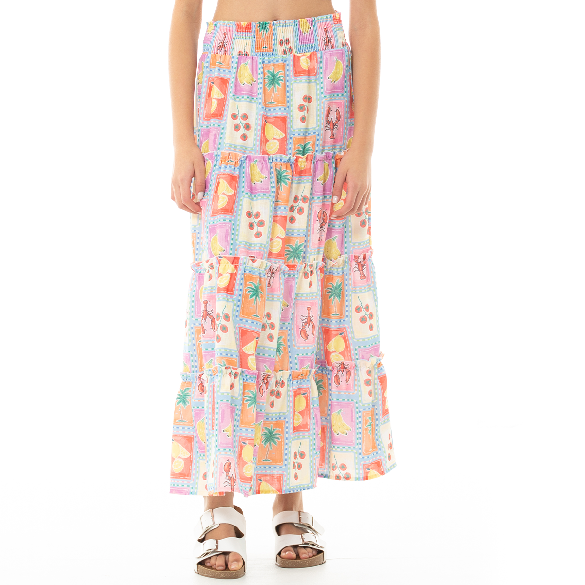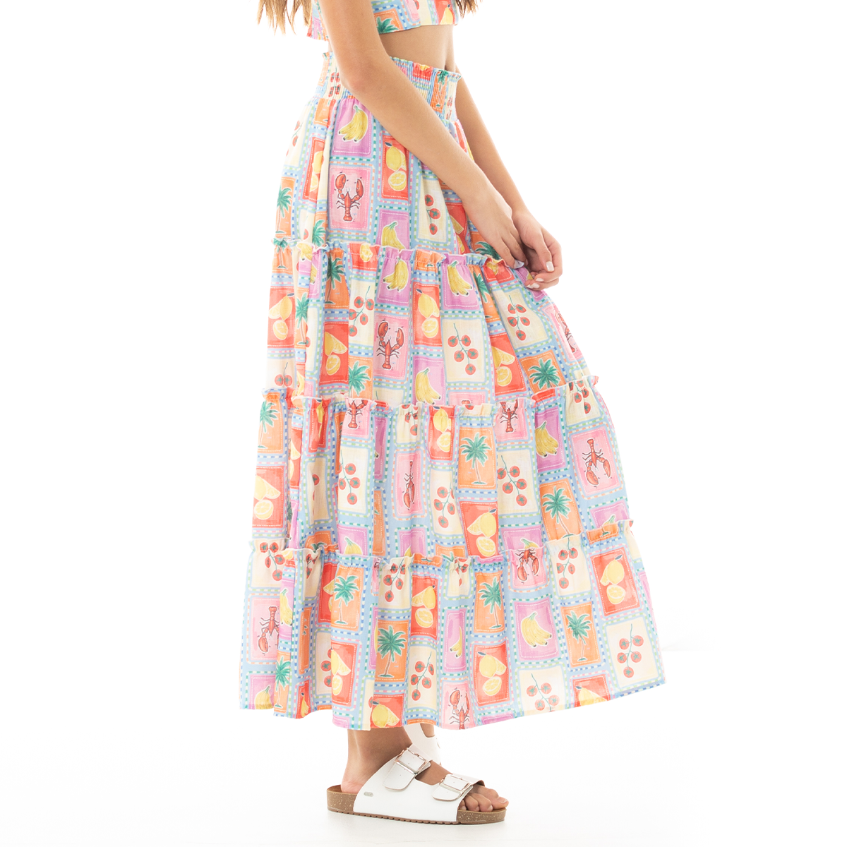 A fresh and colorful maxi skirt designed for summer-ready looks. Featuring a tropical-inspired print with palms, fruits, and graphic details, it brings effortless movement and playful style to any outfit.