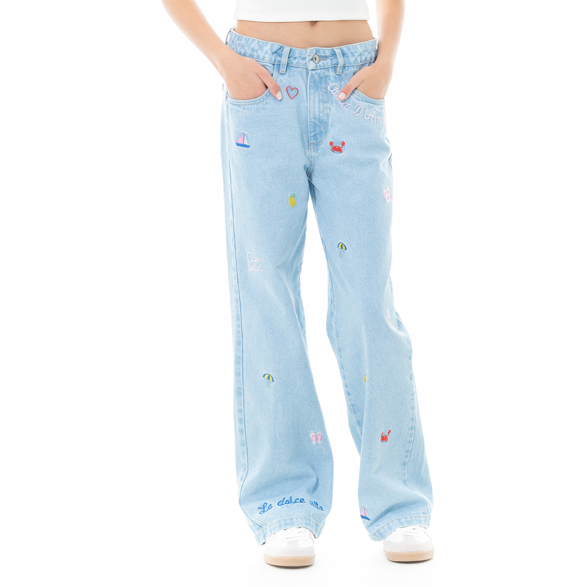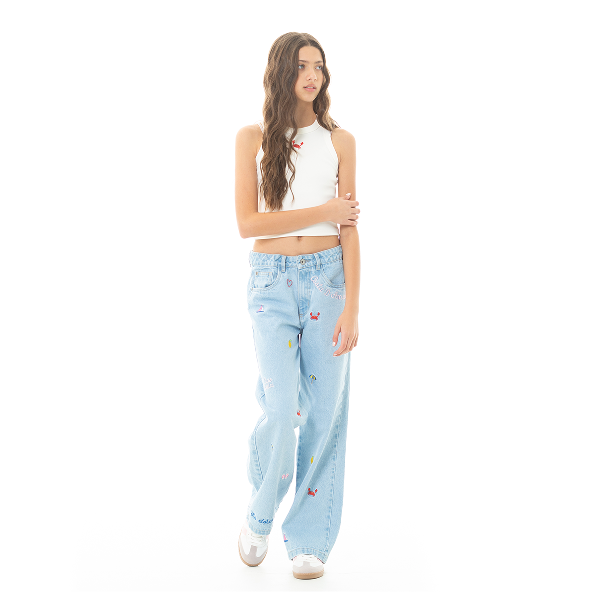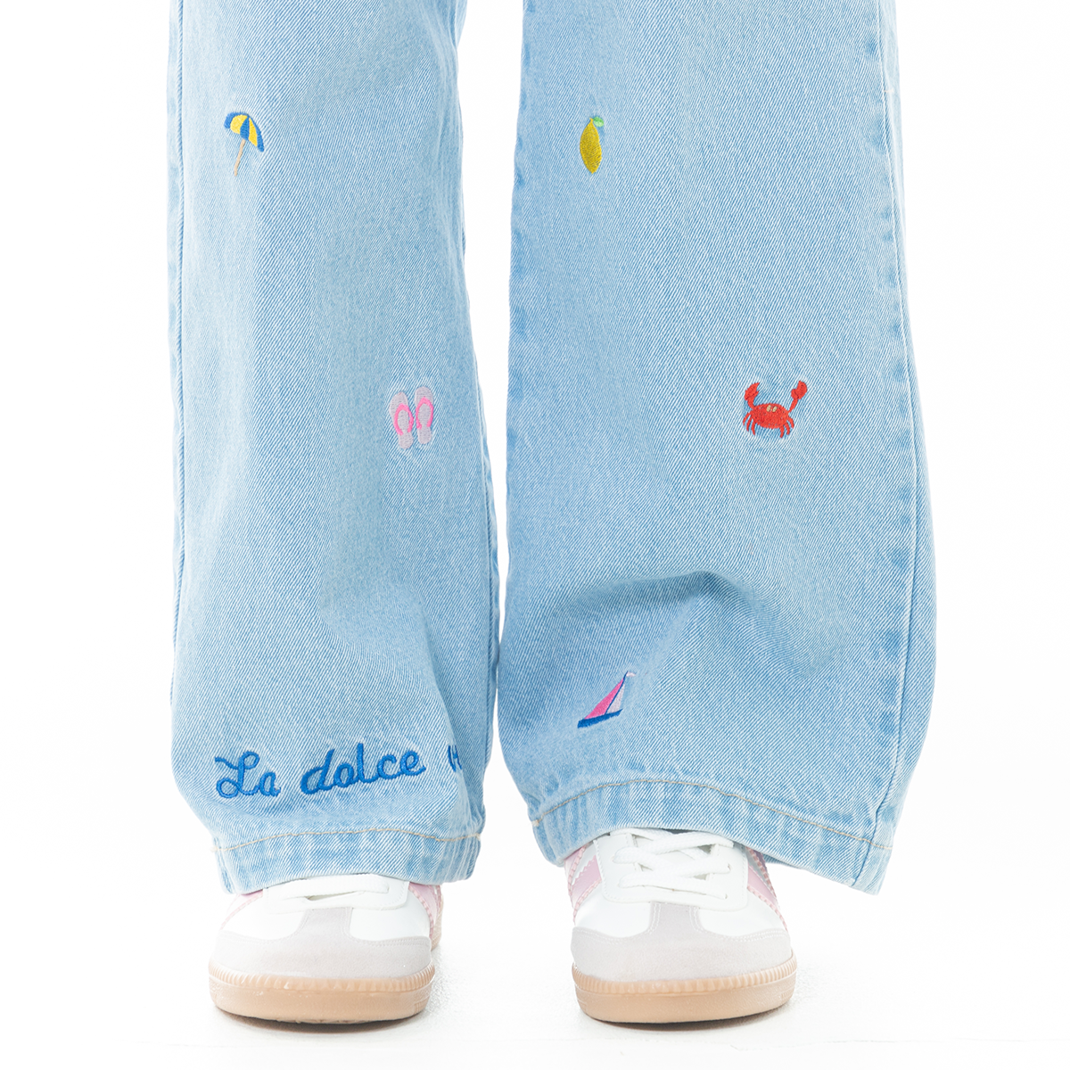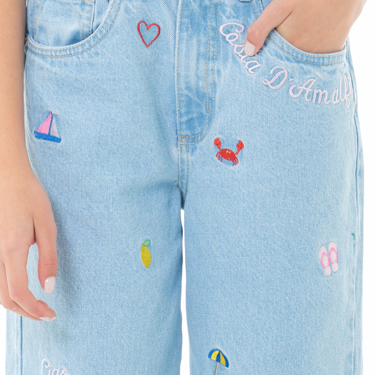 These girls’ Light Blue Wide-Leg Jeans combine everyday comfort with playful embroidered details. Designed in 100% cotton denim, they feature colorful embroidered icons throughout, including mini crabs and summer-inspired motifs that add a fun and elevated touch to a classic silhouette.