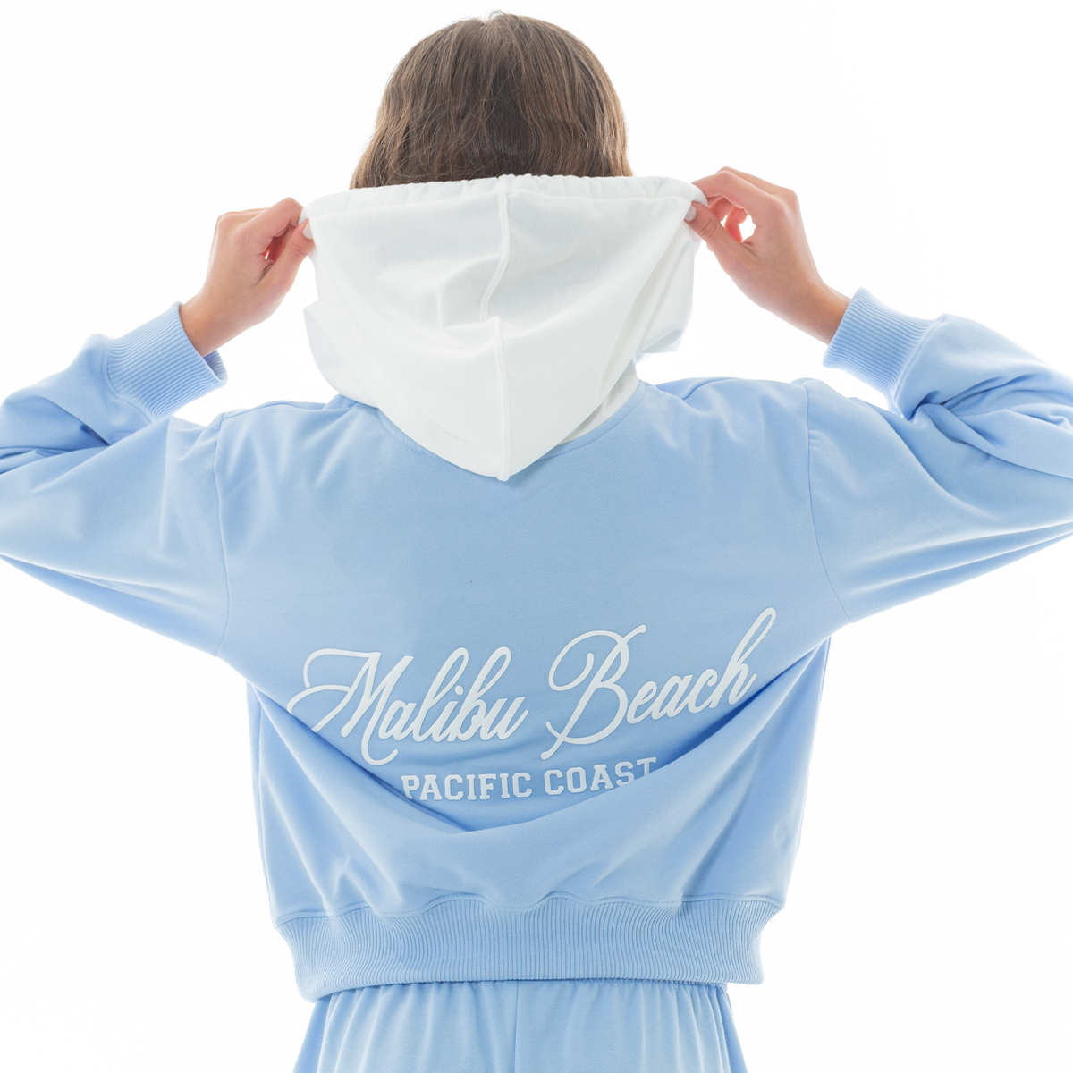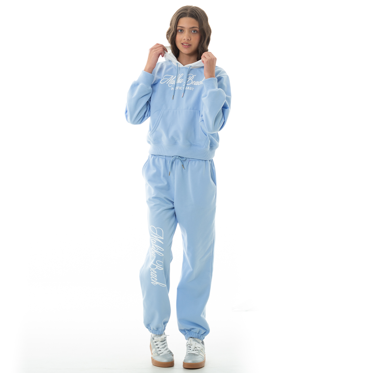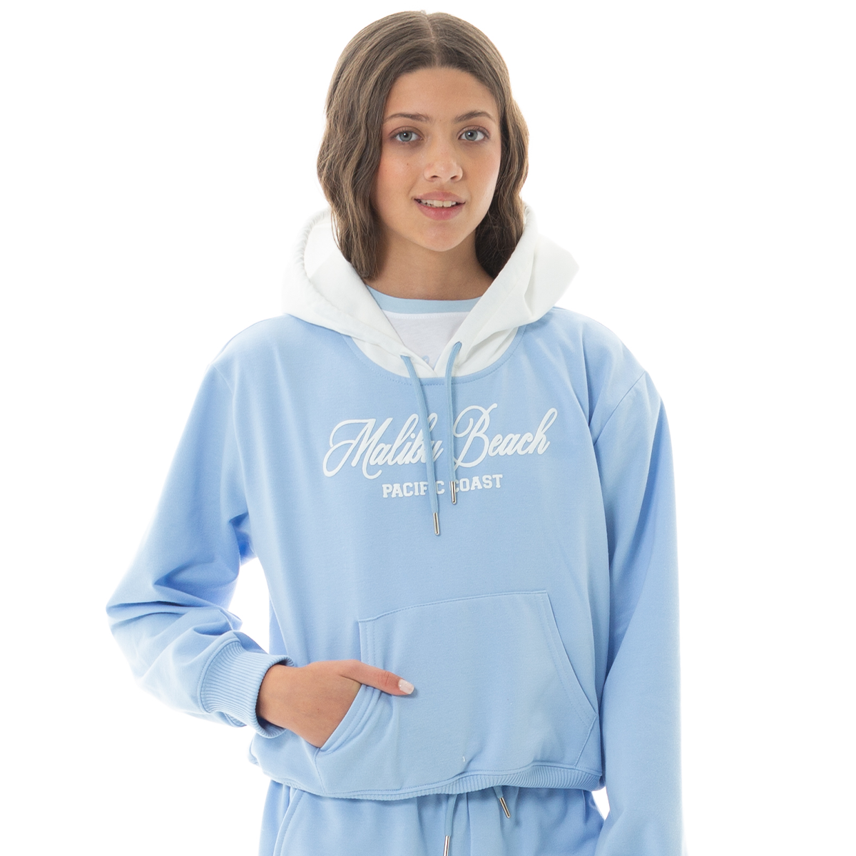 This girls’ Soft Blue hoodie features a relaxed silhouette and “Malibu Beach – Pacific Coast” front graphic for a fresh, West Coast-inspired look. Designed for comfort and effortless styling, it pairs perfectly with the matching jogger Ref. 19568 for a coordinated set. Sold separately.