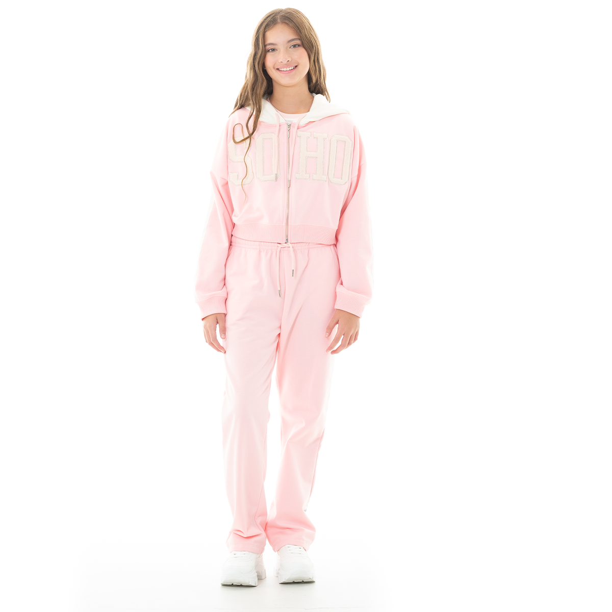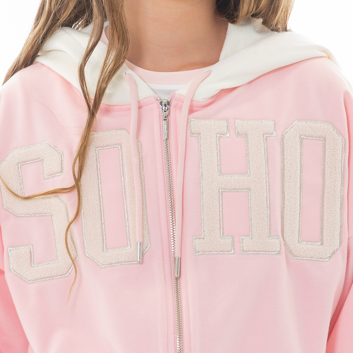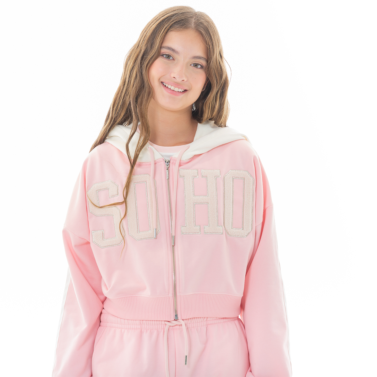 Part of our Comfy Collection, this girls’ Pink SOHO hoodie is designed for softness, ease, and elevated everyday comfort. Featuring a relaxed silhouette and a soft-touch SOHO chenille embroidered detail on the front, it adds texture and a premium Nauty Girl feel. Pair it with the matching jogger Ref. 19563 for a complete cozy look. Sold separately.