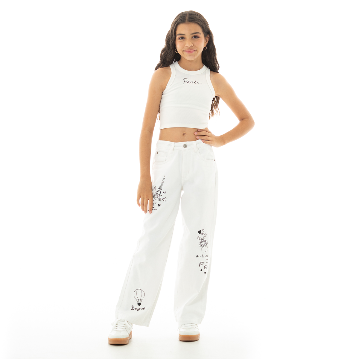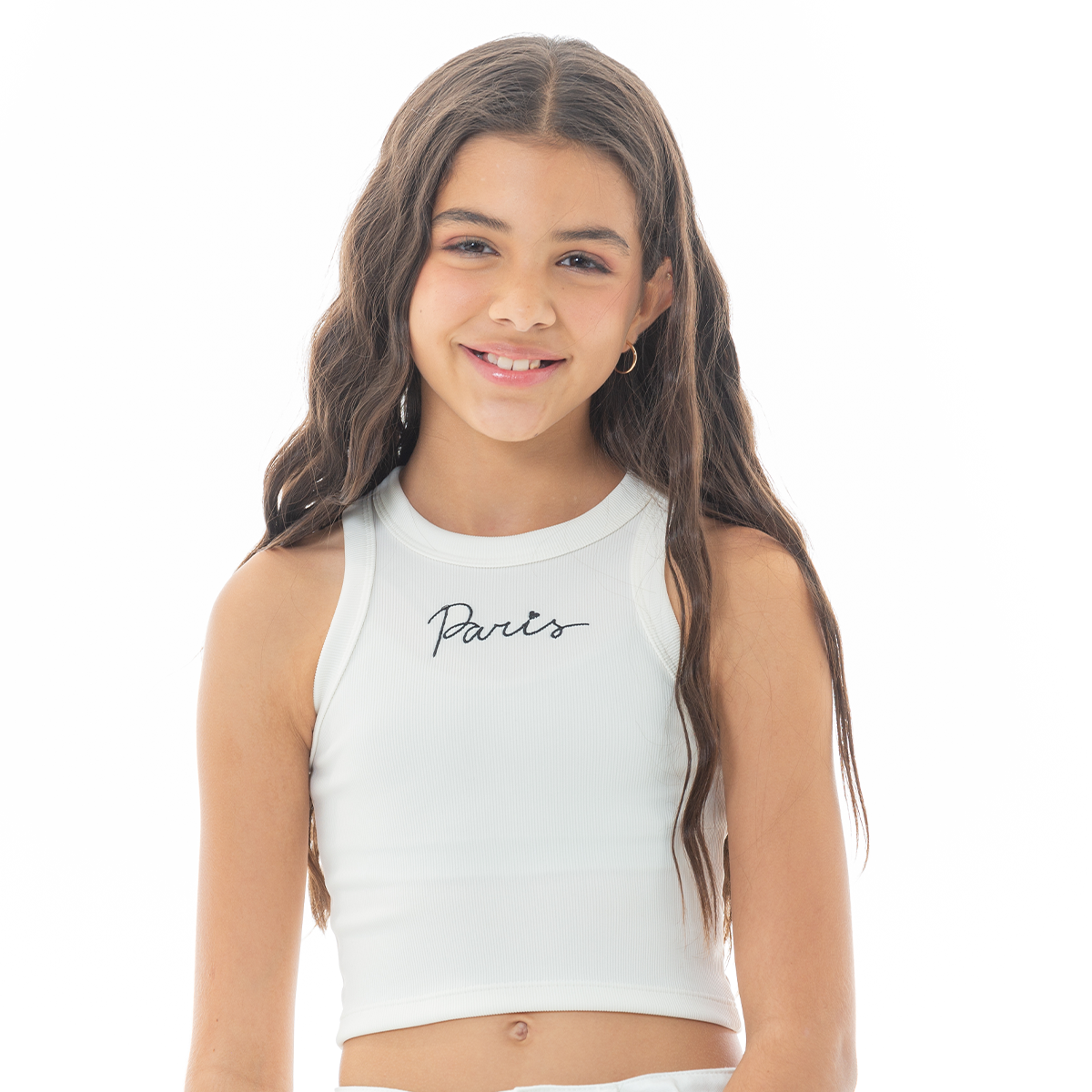A must-have basic with a chic twist. This white ribbed crop top features a delicate embroidered “Paris” text on the front, adding a touch of elegance and style. Soft, stretchy, and easy to pair, it’s the perfect everyday piece for girls who love comfy yet fashionable looks.