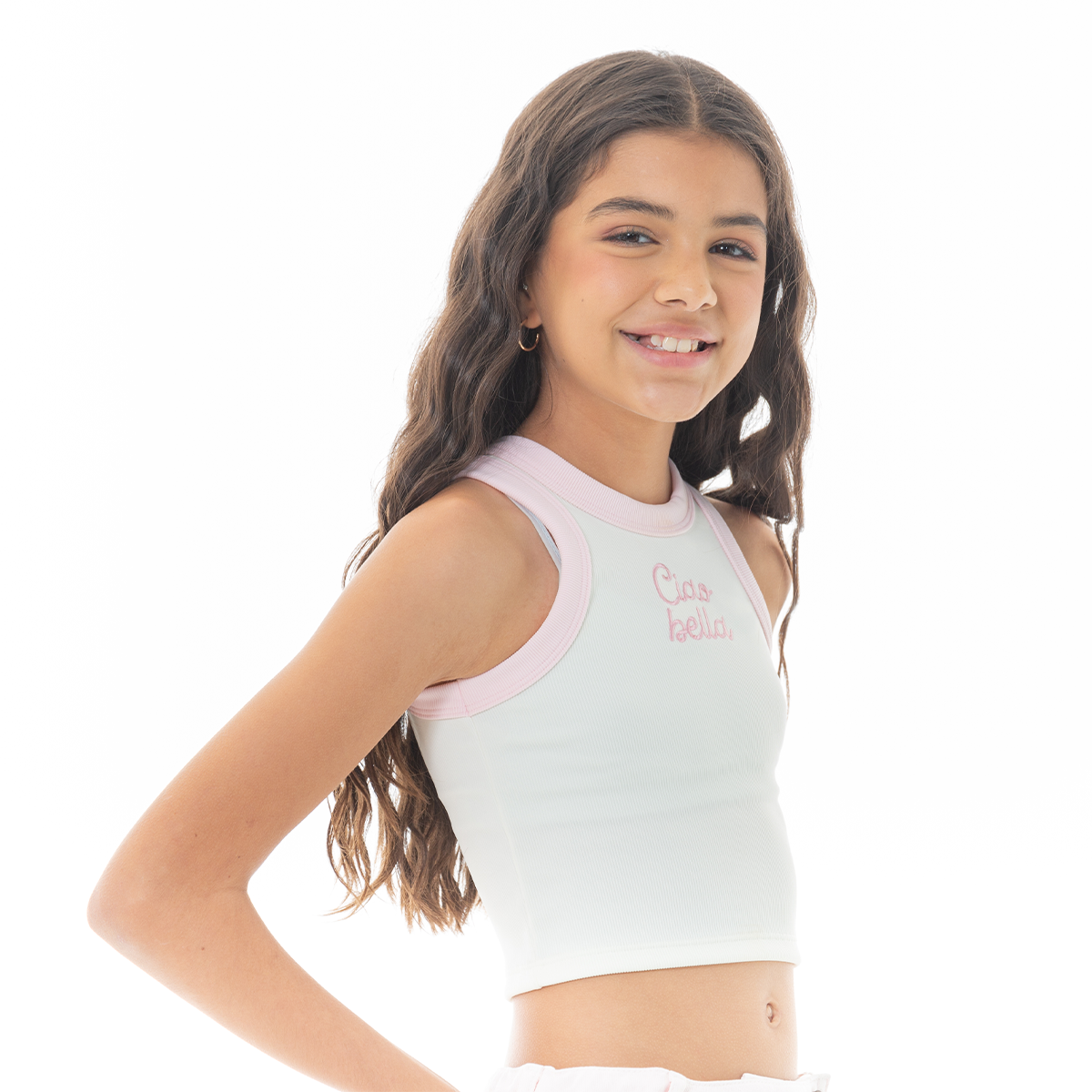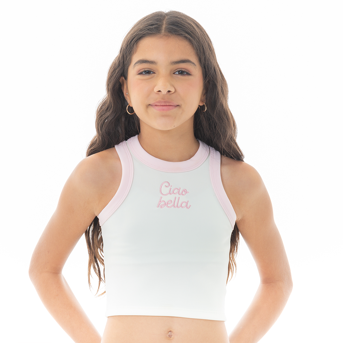 This girls’ White “Ciao Bella” crop tank blends a clean silhouette with a playful statement detail. Designed in a soft ribbed fabric, it features a delicate pink embroidered “Ciao Bella” detail on the front, adding texture and an elevated finish.