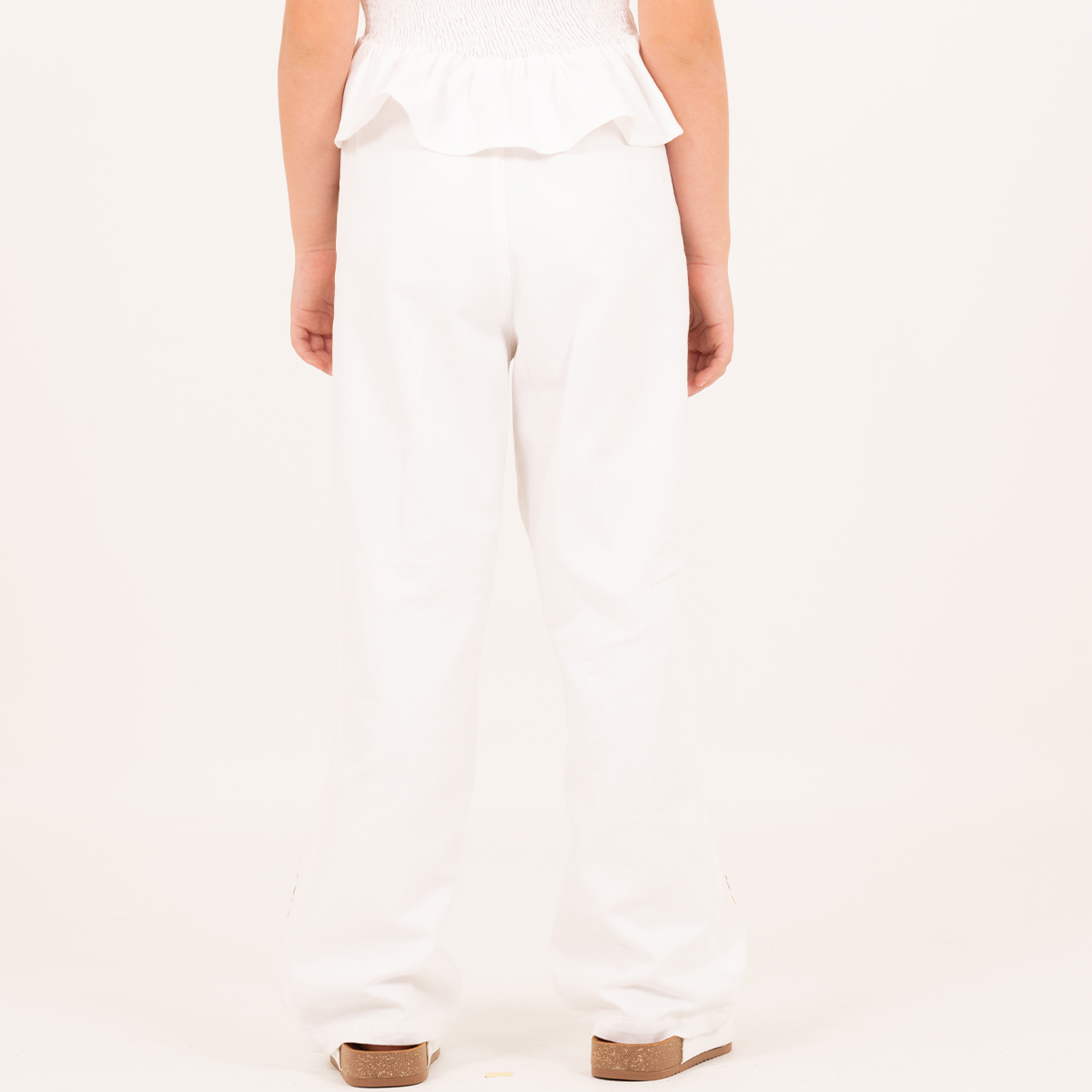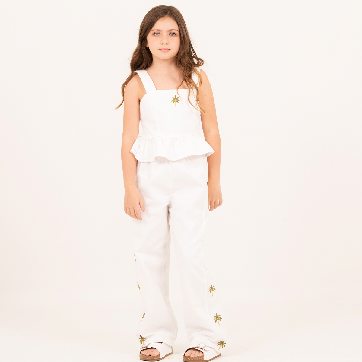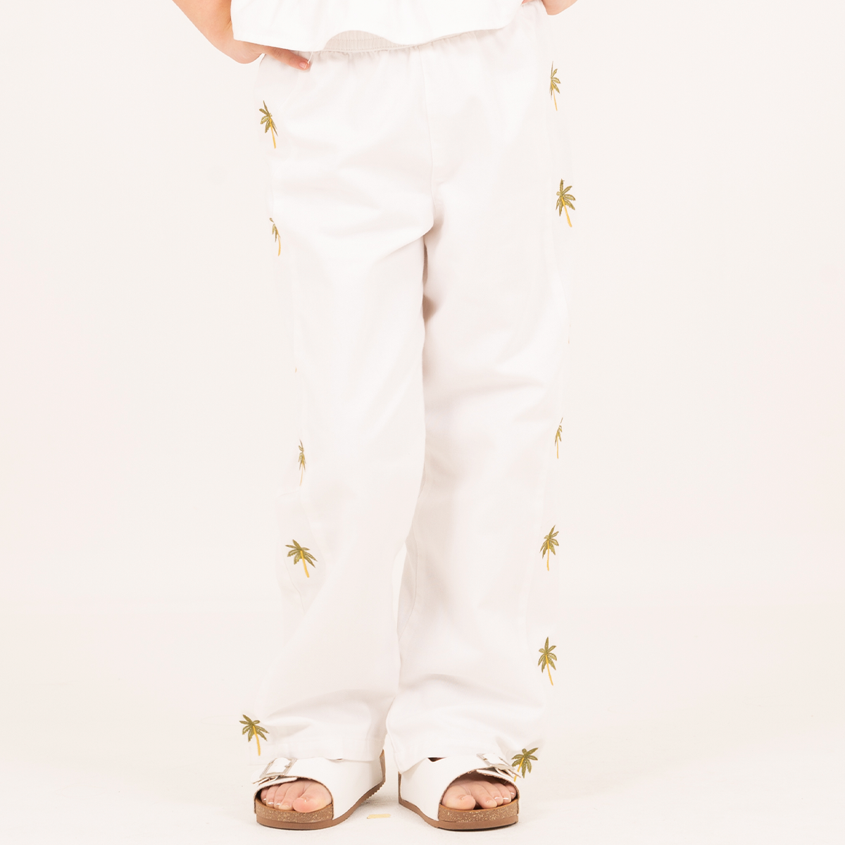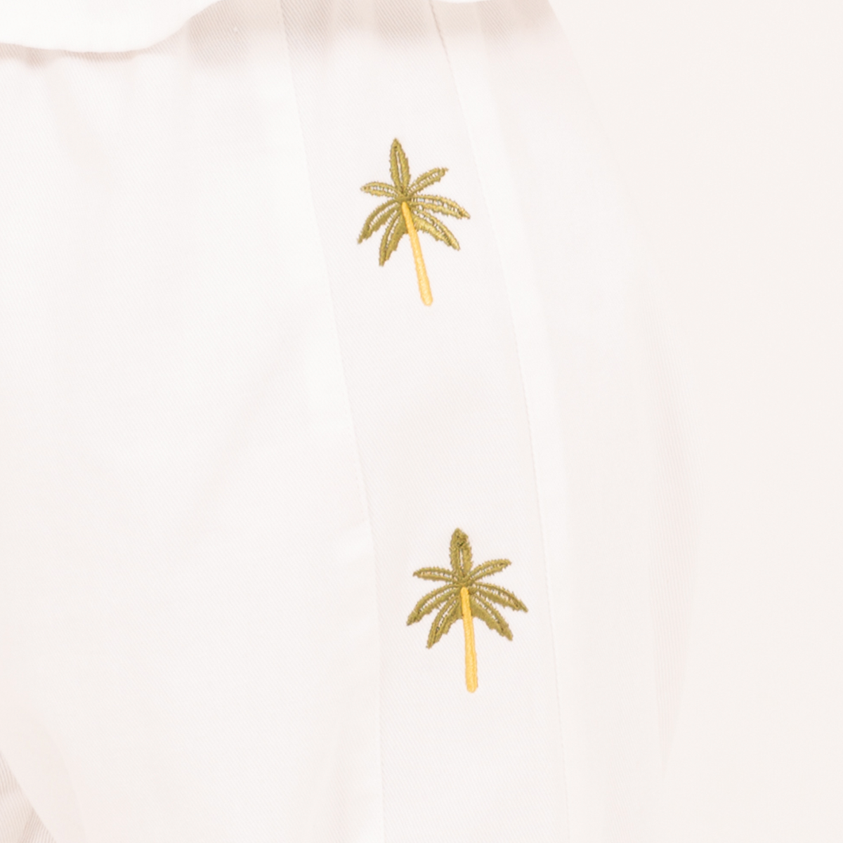 Off-white pants with delicate palm embroidery and a relaxed silhouette for a fresh and effortless look.