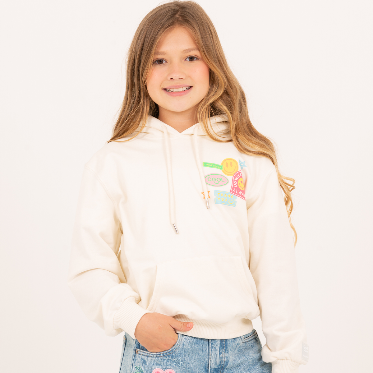 Soft hoodie with colorful patch-style prints on the front and back for a fun and expressive look.