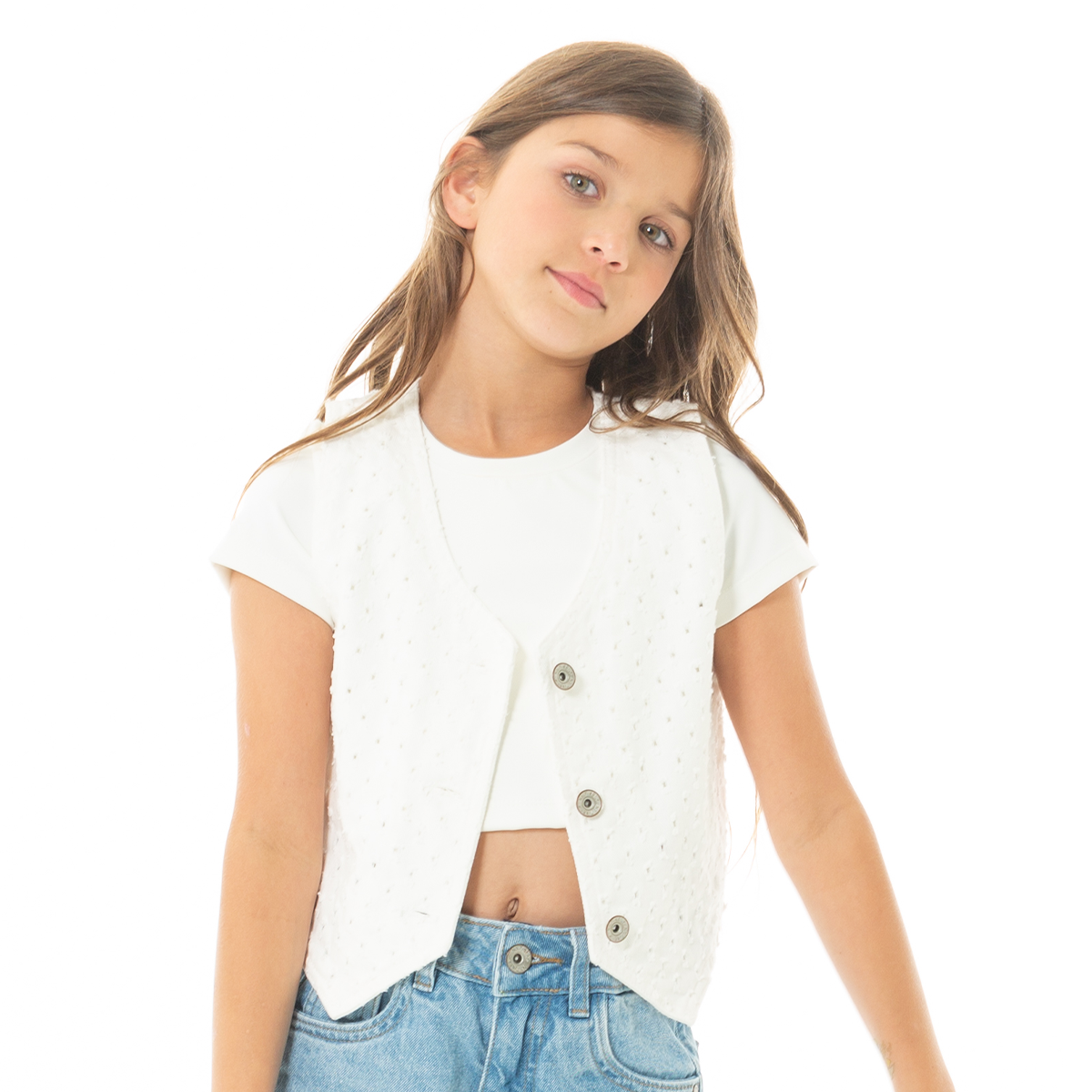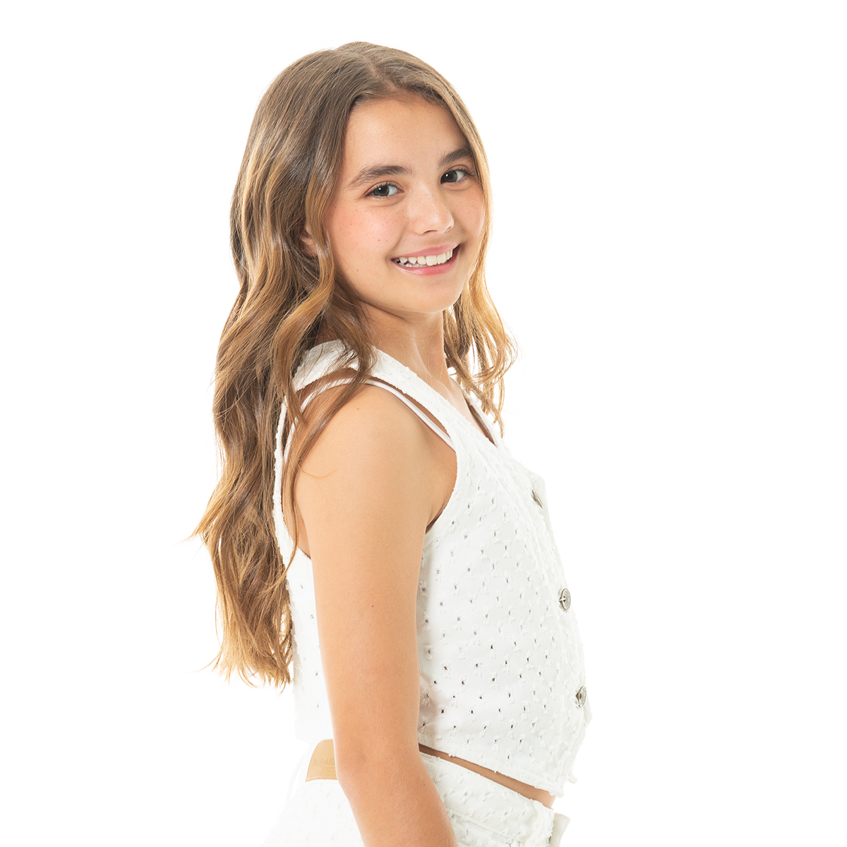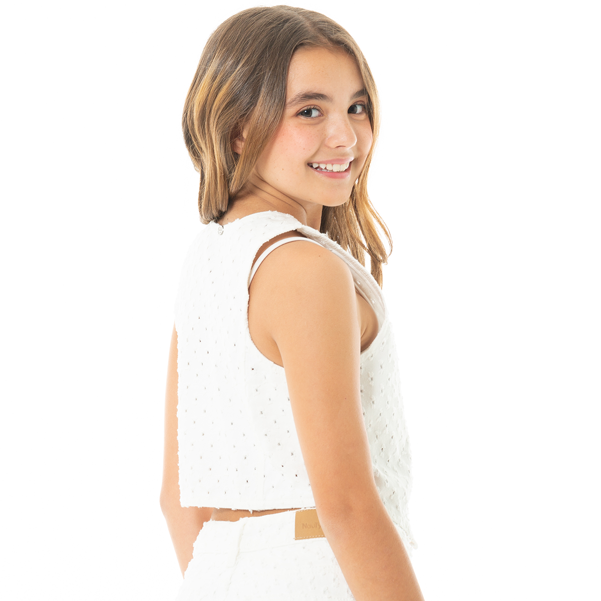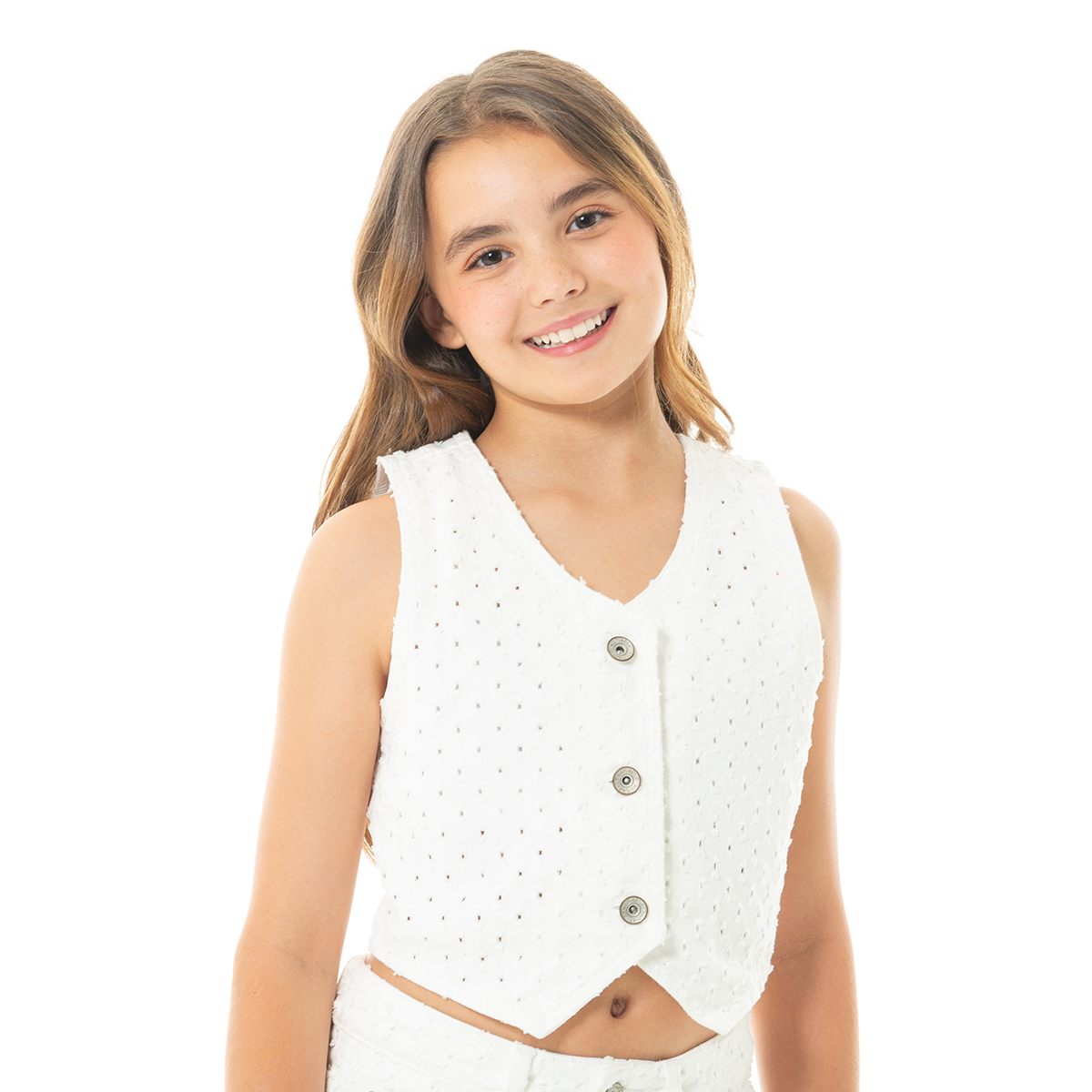 A stylish white drill vest designed with a delicate eyelet texture that adds a fresh, modern touch to any outfit. Lightweight, comfortable, and perfect for layering in every season.